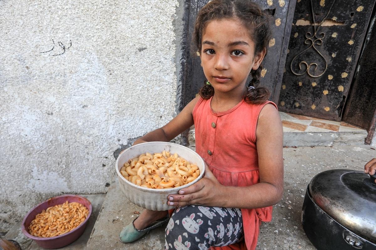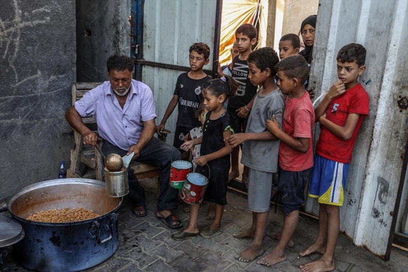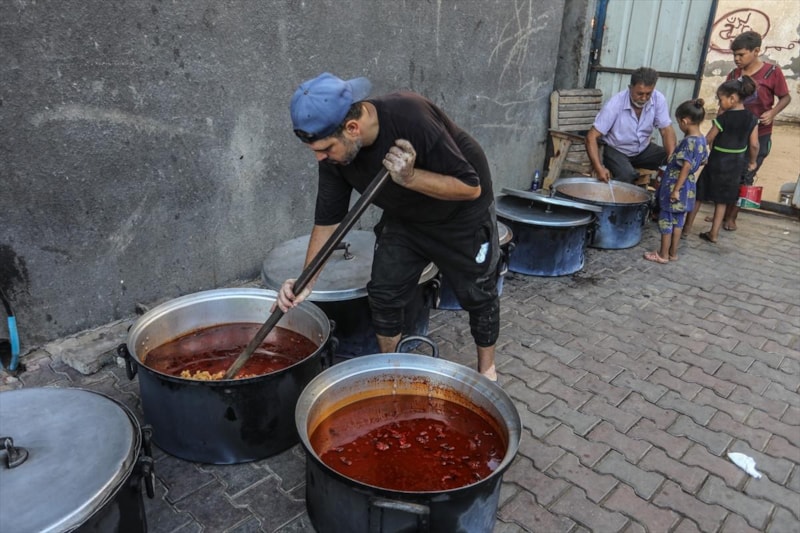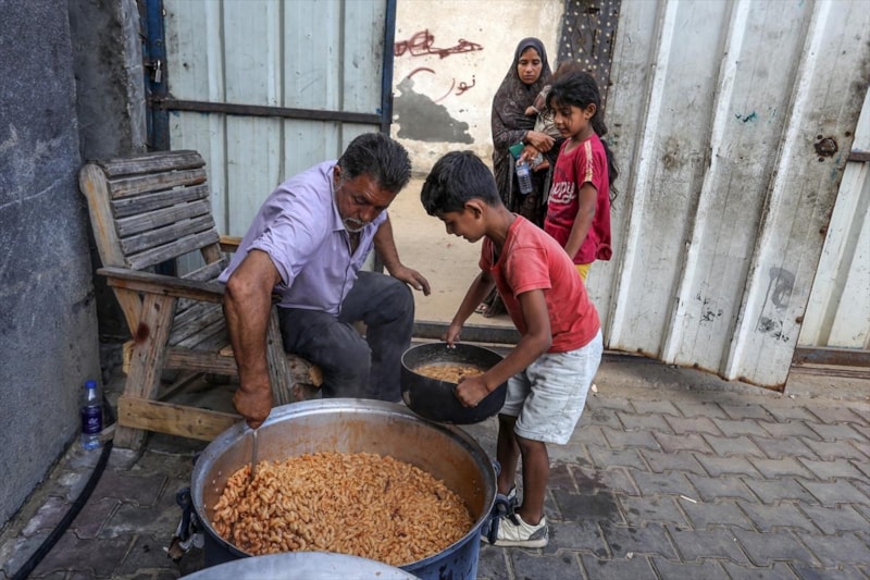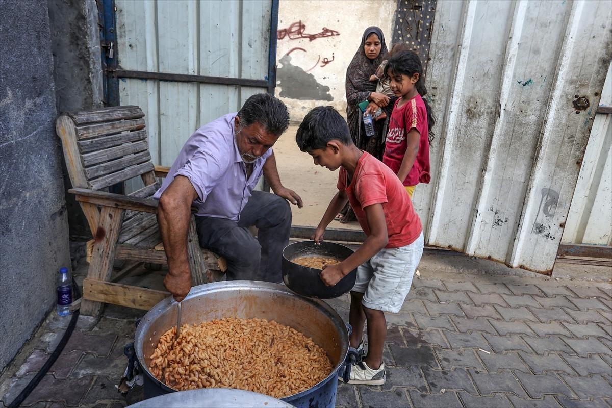 Gazze'deki gönüllüler, Deyr Belah kentine sığınan yerinden edilmiş Filistinliler için sıcak yemek dağıttı. Aralarında çocukların da bulunduğu Filistinliler dağıtılan yemeklerden alabilmek için kuyrukta beklerken gönüllüler yemekleri tencere ve kaplara doldurarak paylaştırdı.