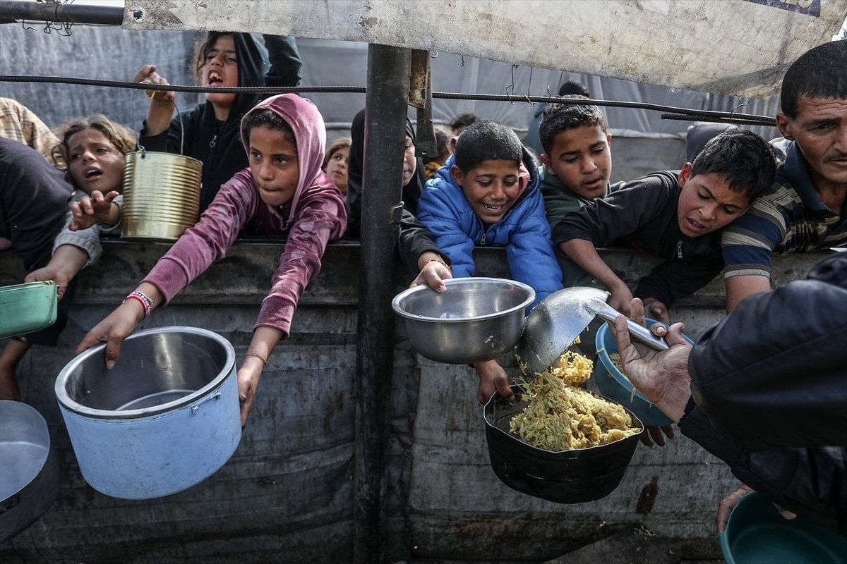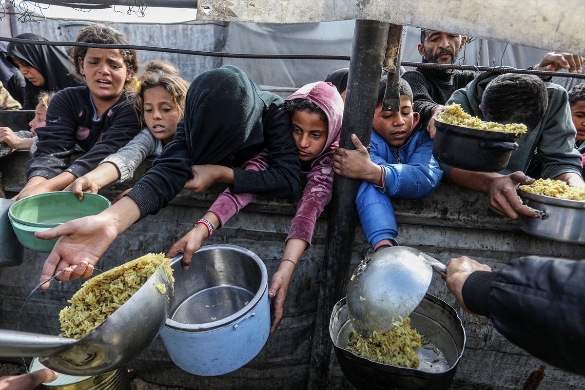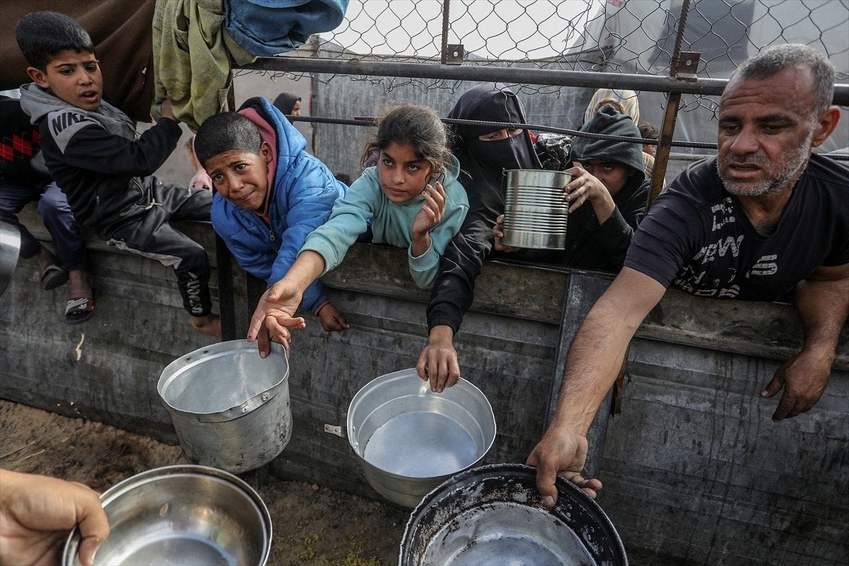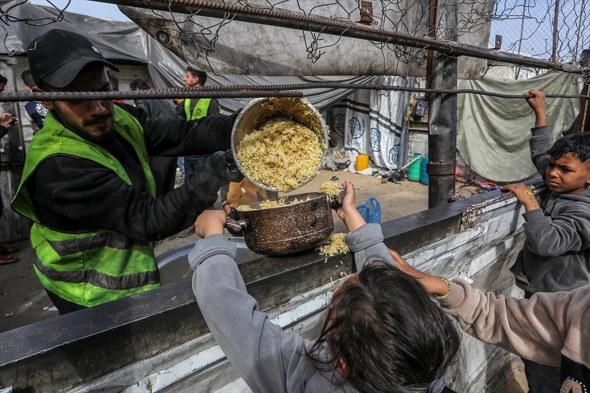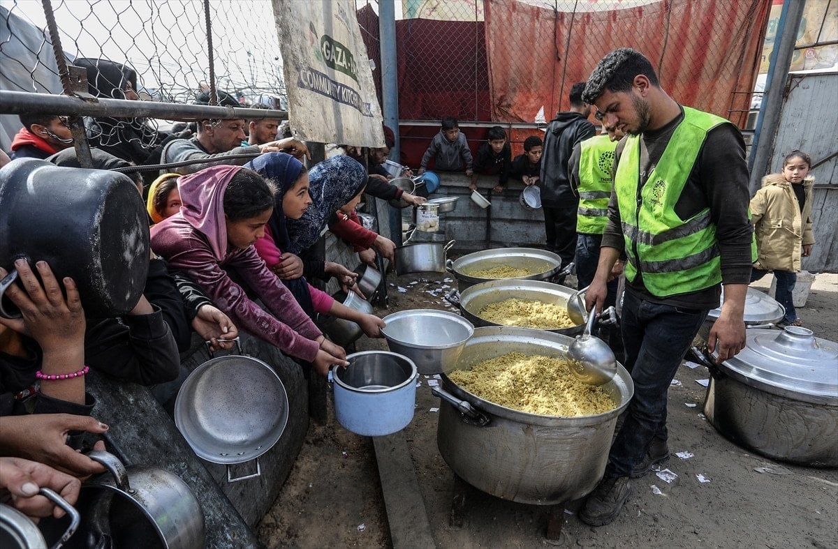 Gazze Şeridi’nin güneyindeki Han Yunus kentinin Mevasi bölgesinde yaşayan yüzlerce yerinden edilmiş Filistinli, bir öğün sıcak yemek alabilmek için kurulan hayır mutfaklarının önünde uzun kuyruklar oluşturuyor.