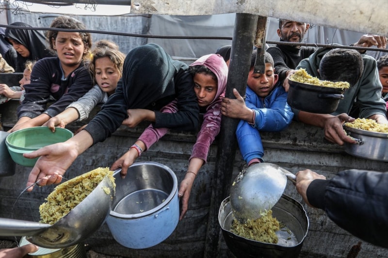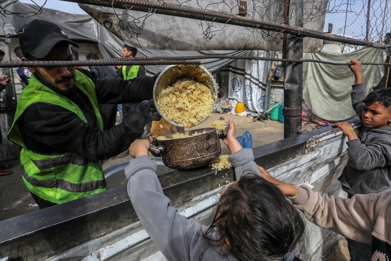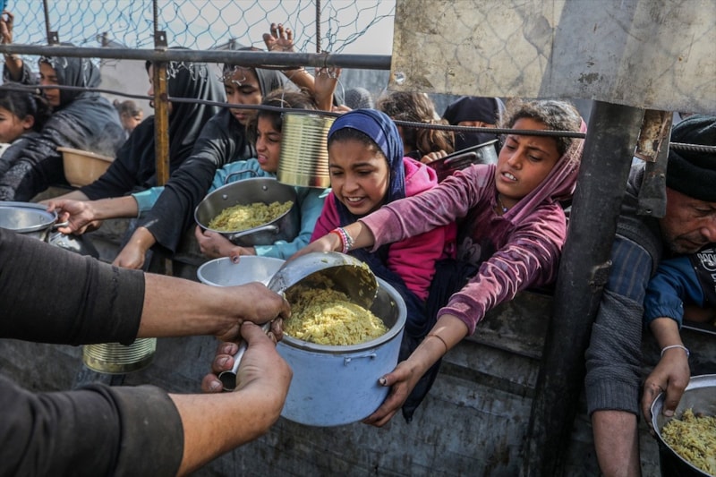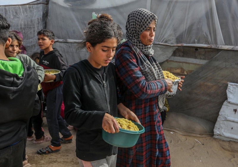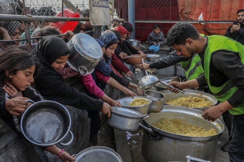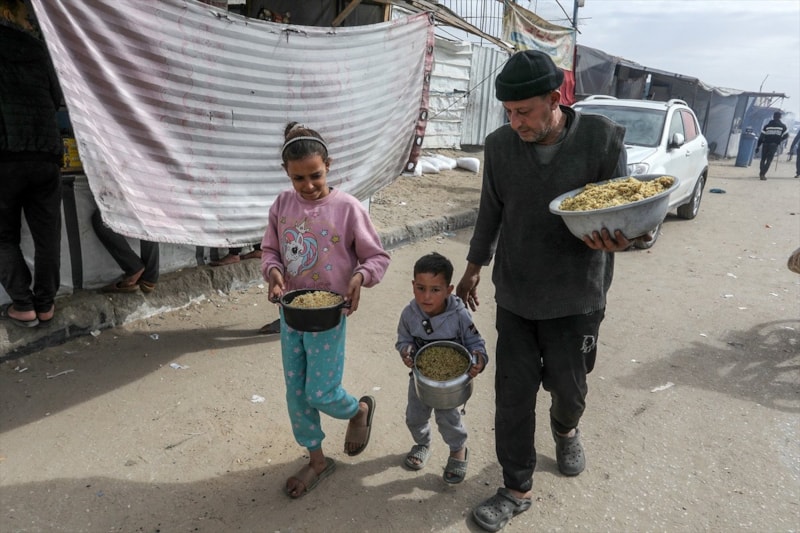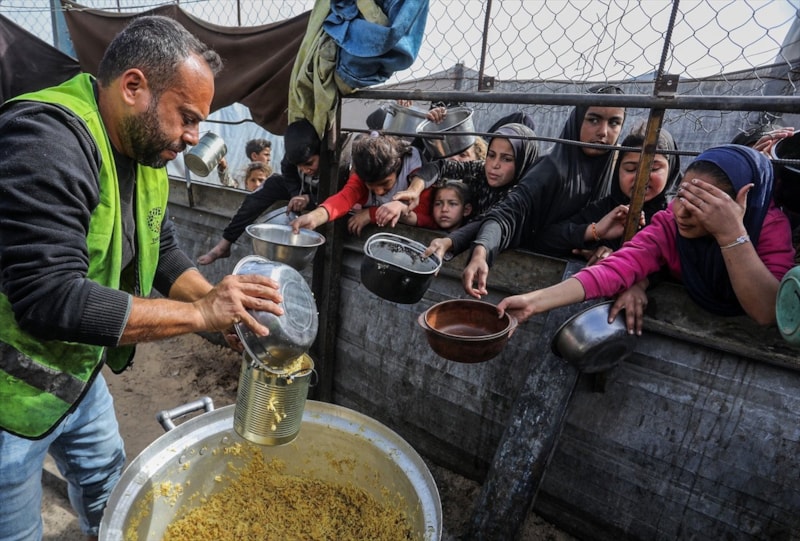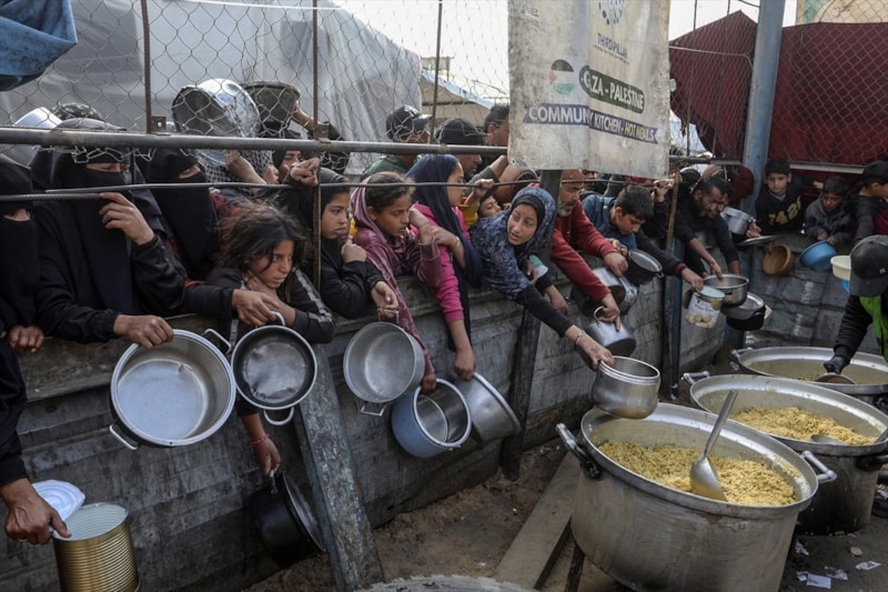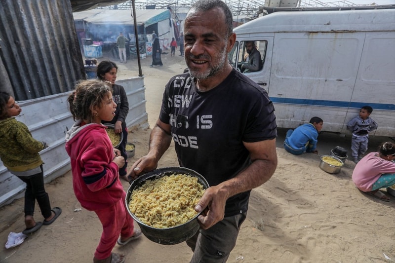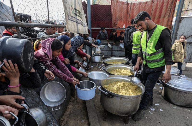 Sıcak yemek dağıtımı için saatlerce sıra bekleyen Filistinliler, çoğu zaman çocuklarının karnını doyurmaya yetecek tek bir öğünle yetinmek zorunda kalıyor.