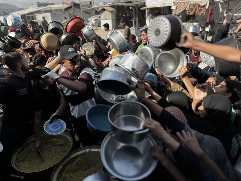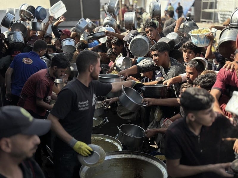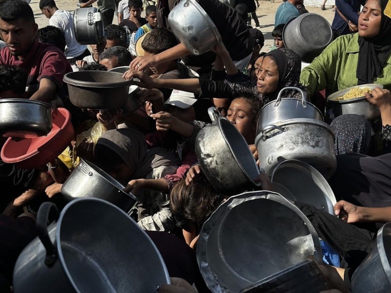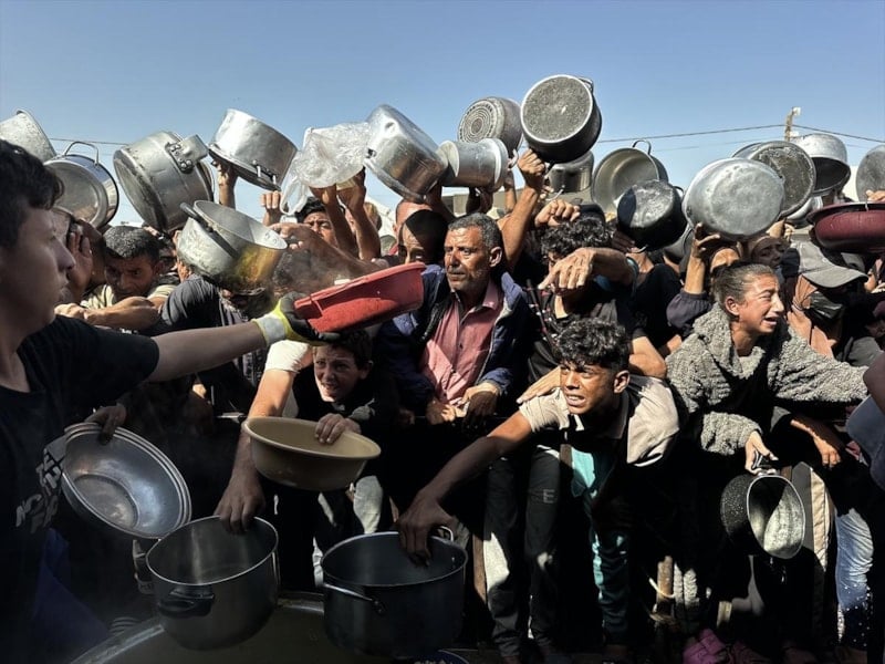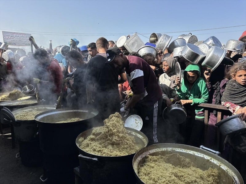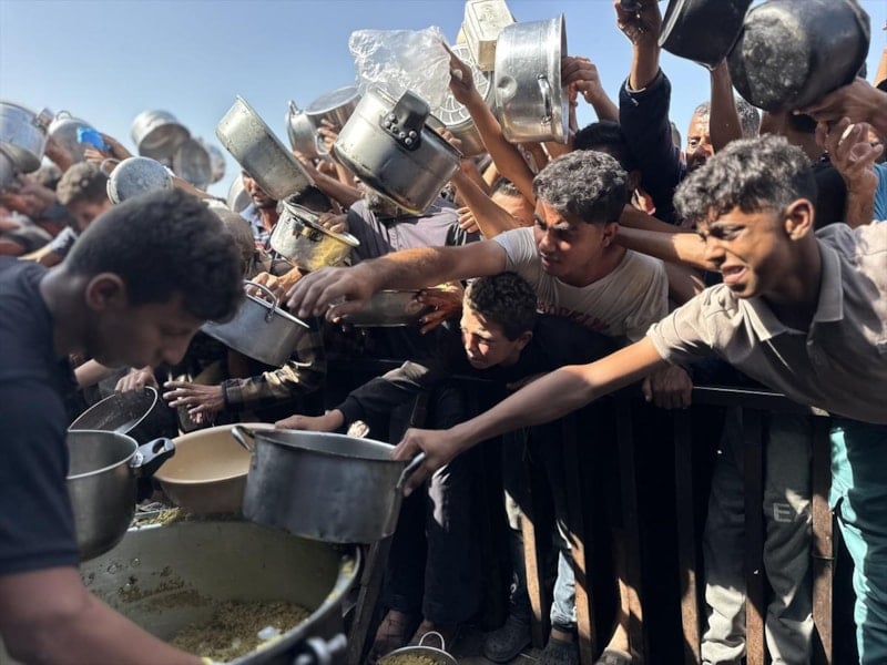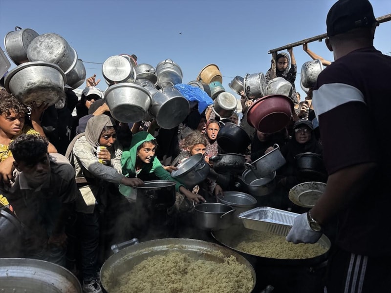 Gazze'nin güneyindeki Han Yunus'ta bir hayır kuruluşu tarafından kurulan yemek dağıtım noktasında, İsrail'in açlığa mahkum ettiği Filistinlilere yemek dağıtıldı.