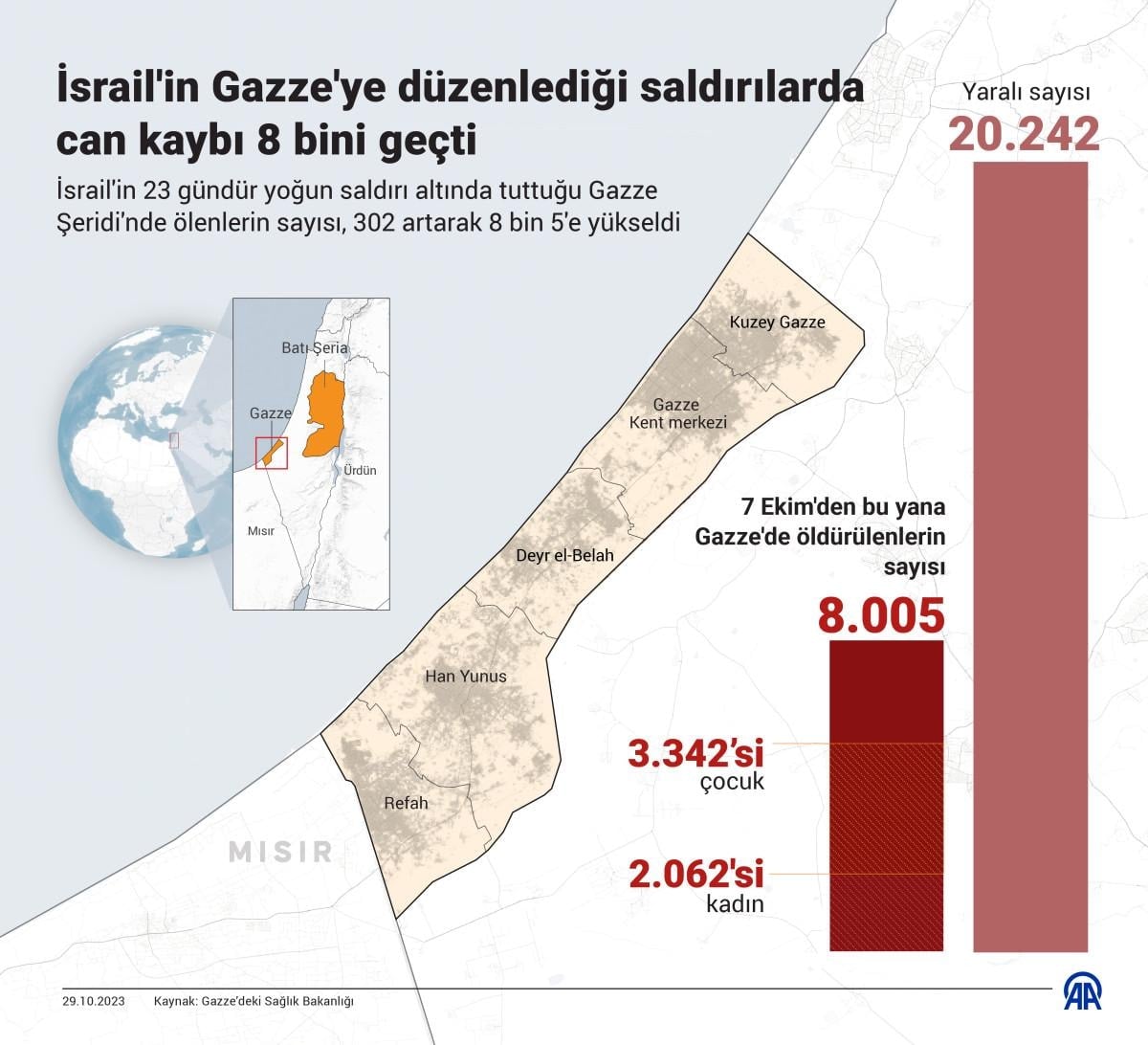 Gazze Sağlık Bakanlığı saldırılarda ölenlerin sayısının son 24 saatte 302 artarak 8 bin 5'e yükseldiğini bildirdi.