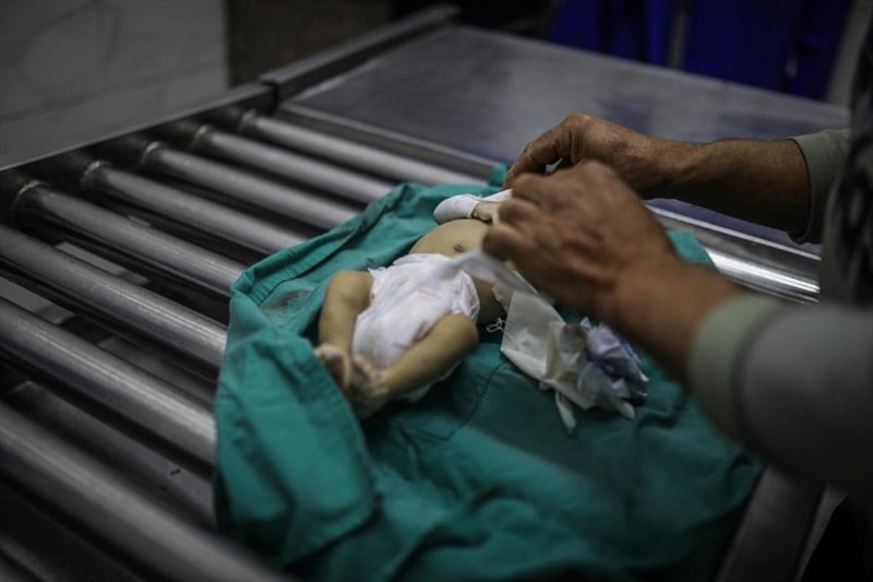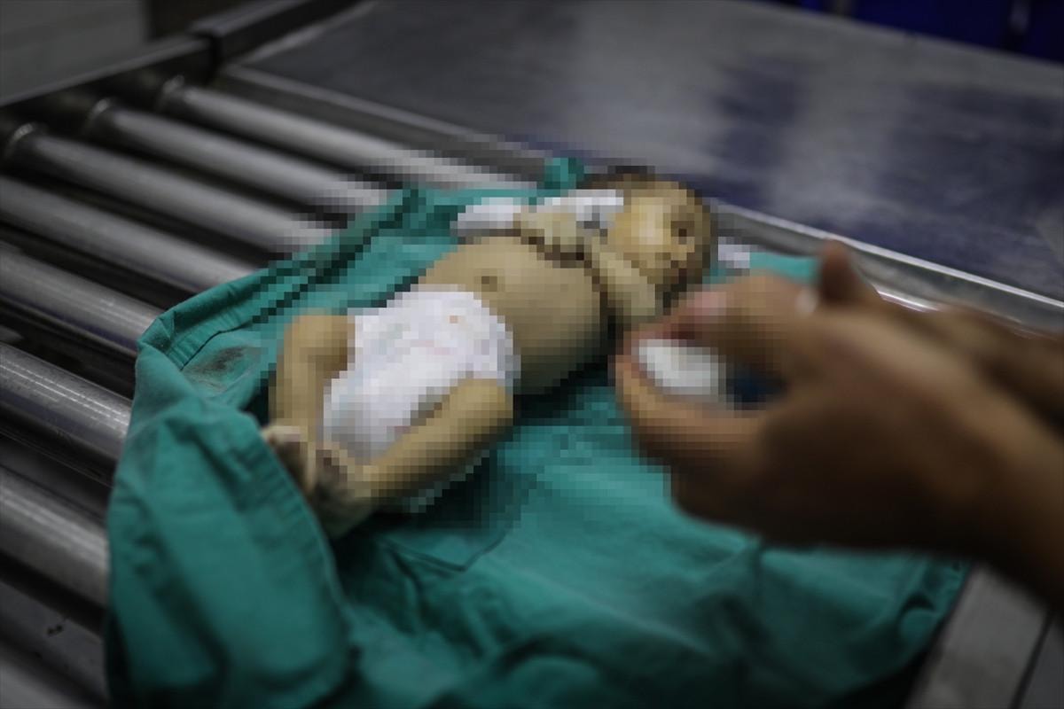 Gazze'li bebeğin naaşı, cenaze işlemleri için Gazze kentindeki Şifa Hastanesi'ne getirildi.
