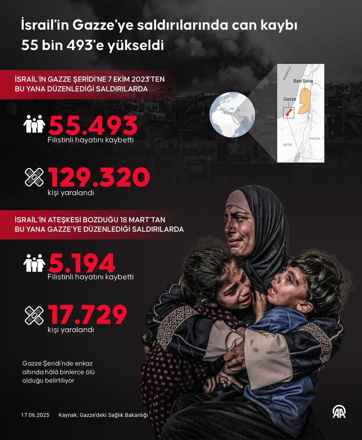 İsrail saldırılarının başladığı 7 Ekim 2023'ten bu yana ortaya çıkan bilançonun da aktarıldığı açıklamada, toplam can kaybının 55 bin 493'e, yaralı sayısının da 129 bin 320'ye yükseldiği ifade edildi.