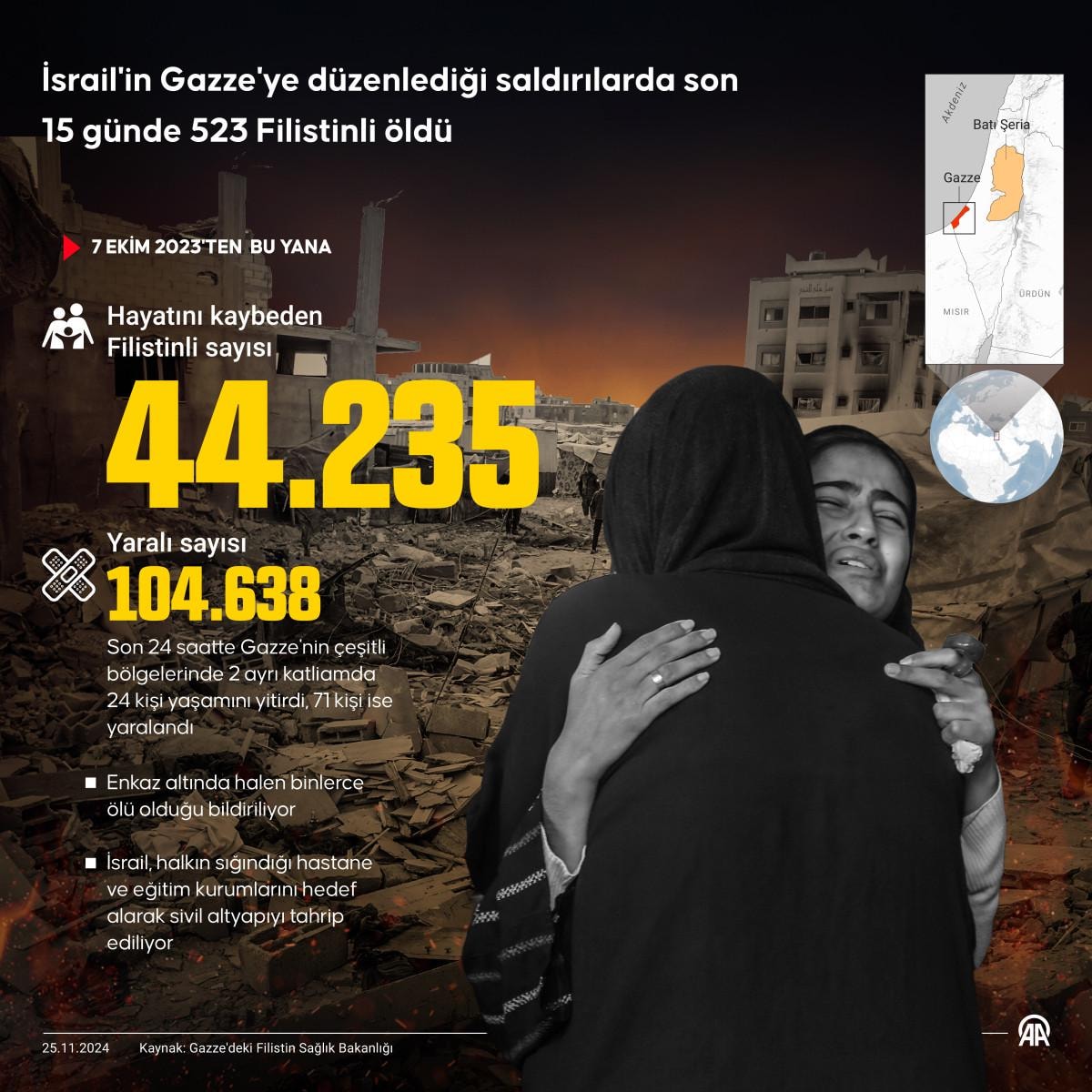 Filistin Sağlık Bakanlığı'ndan yapılan açıklamada, İsrail'in 7 Ekim'den bu yana Gazze Şeridi'ne düzenlediği saldırılarda yaşamını yitirenlerin sayısının 44 bin 235'e yükseldiği kaydedildi.