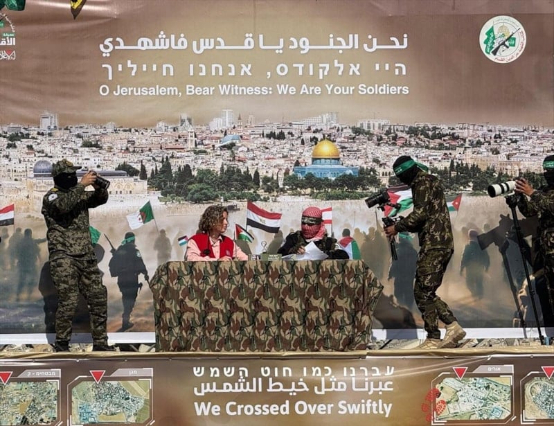 Hamas'ın esir takası yapacağı sahnede koyduğu bir pankartta yazılan yazı ise dikkat çekti.