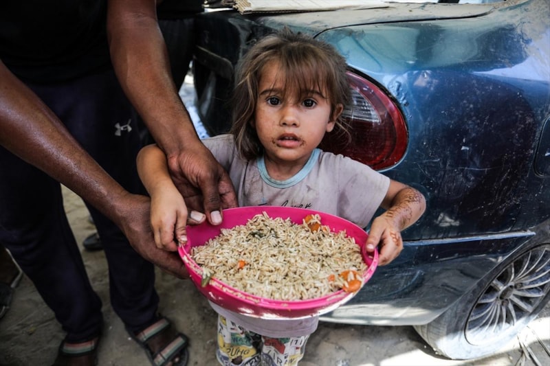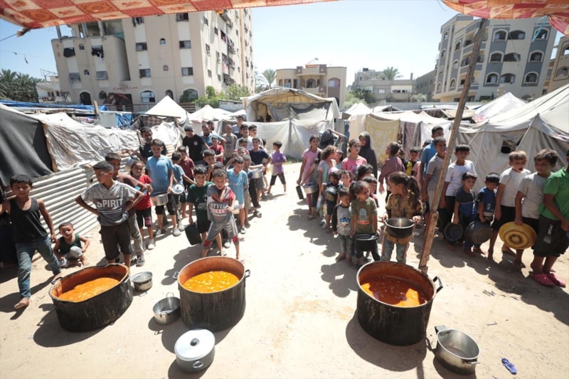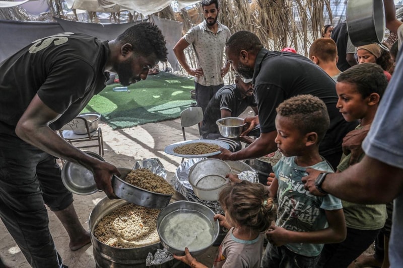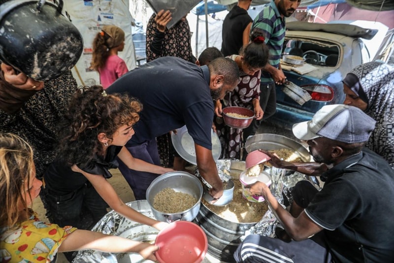 İsrail'in Gazze Şeridi'ne uyguladığı tam ambargo sebebiyle temel gıda malzemelerine erişim sağlanamazken, Filistinli bir yardım kuruluşunun çalışmaları ile bölgeye sıcak yemek dağıtımı gerçekleştirildi.