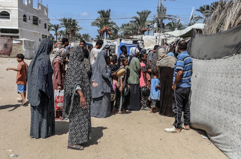 Deyr Balah kentindeki Filistinliler, hayır kurumlarının dağıttığı yemeklerden ailelerine alabilmek için uzun kuyruklar oluşturdu.