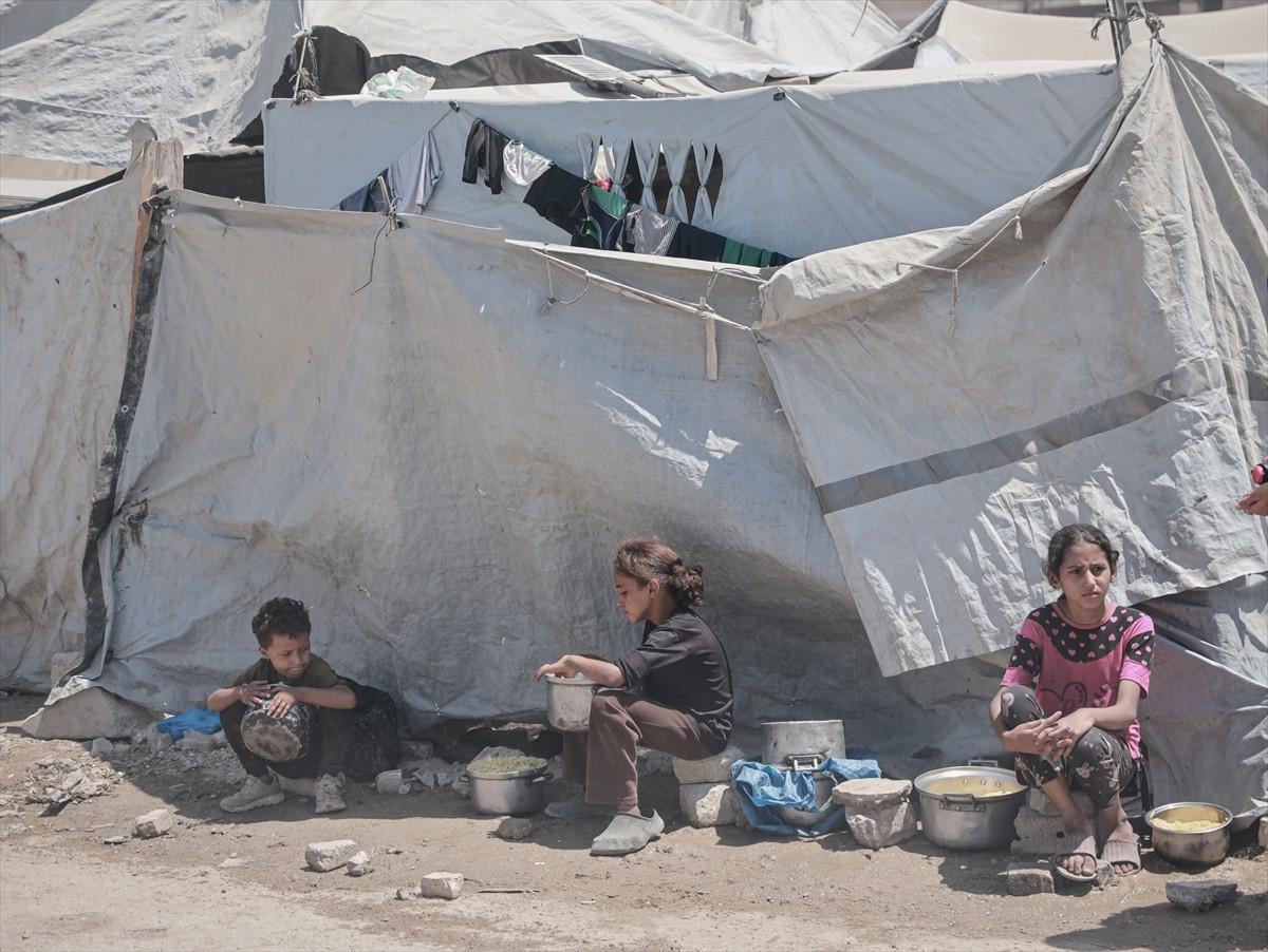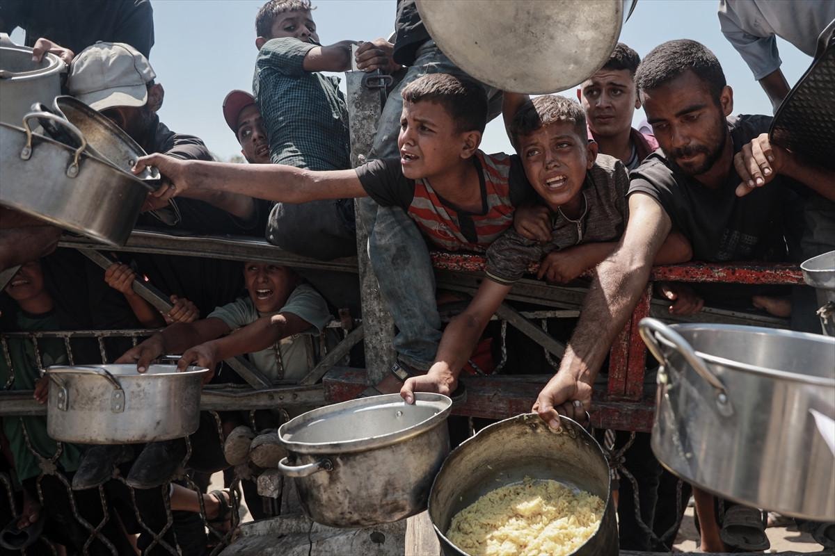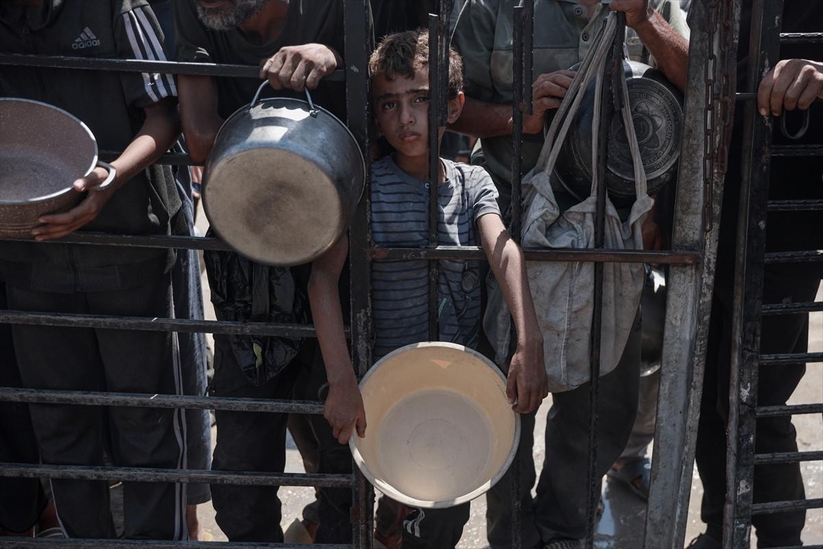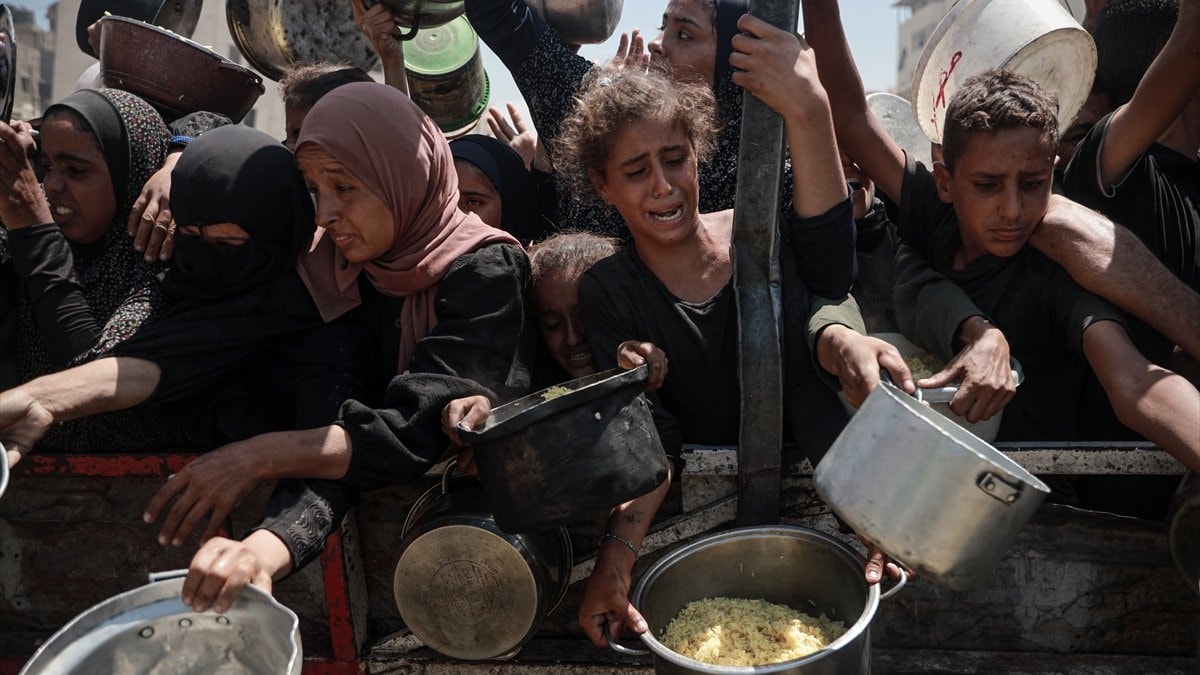 Açlıkla mücadele eden Filistinliler, bir tencere yemek alabilmek için kavurucu sıcağa rağmen saatlerce kuyrukta bekliyor.