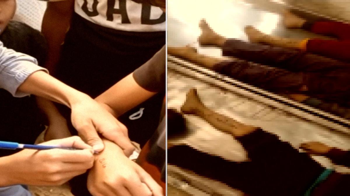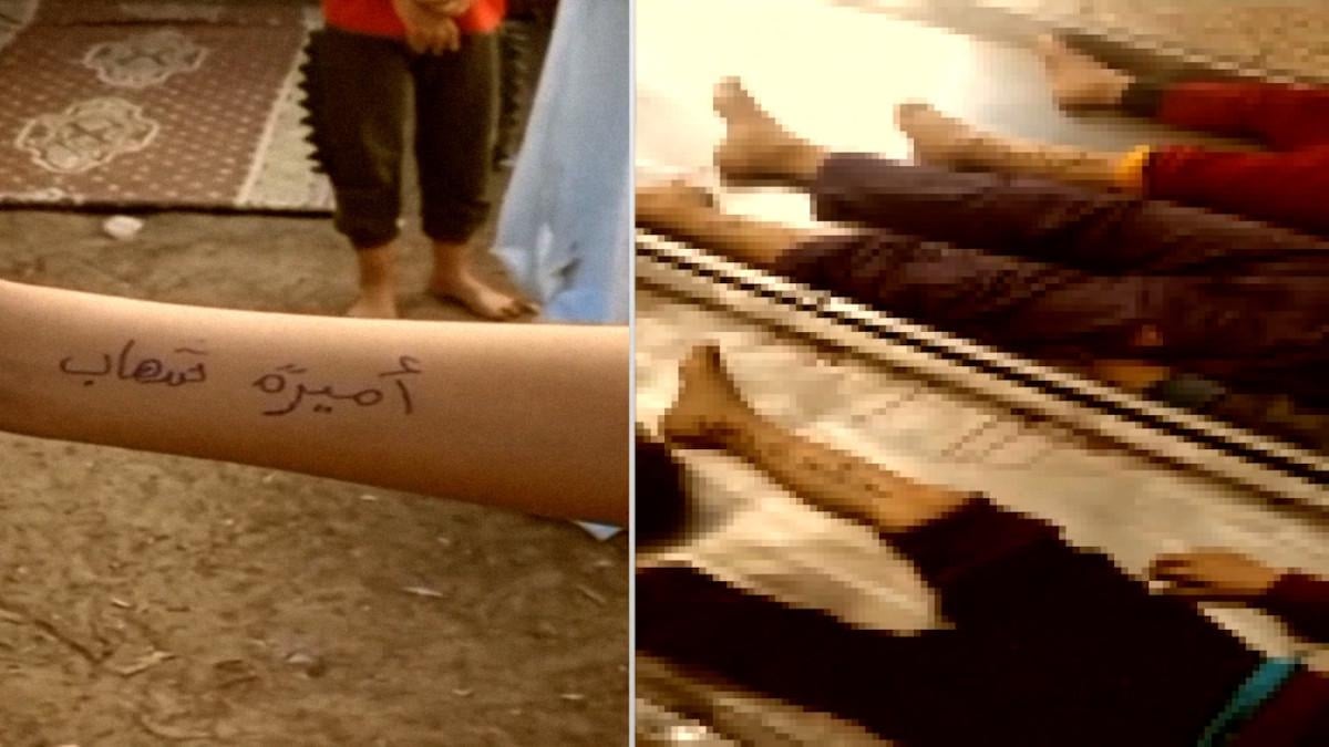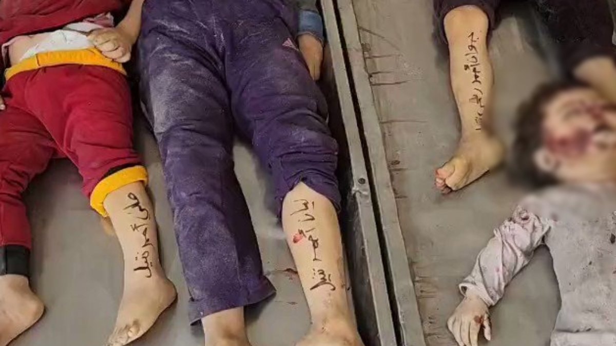 Paylaşılan bir videoda bileklerine isimleri yazılan çocukların cansız bedenleri görüntülendi.