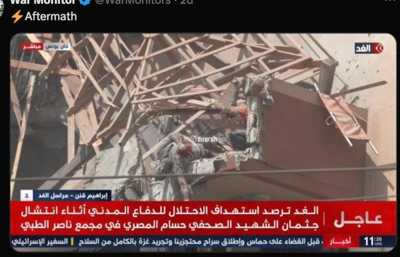 İsrail ordusunun Nasır Hastanesi'nin 4. katına düzenlediği hava saldırısında ilk belirlemelere göre 4'ü gazeteci 15 kişi öldü, çok sayıda kişi yaralandı. Saldırı anı kameralara yansırken milyonlarca insan, o anları canlı izledi.