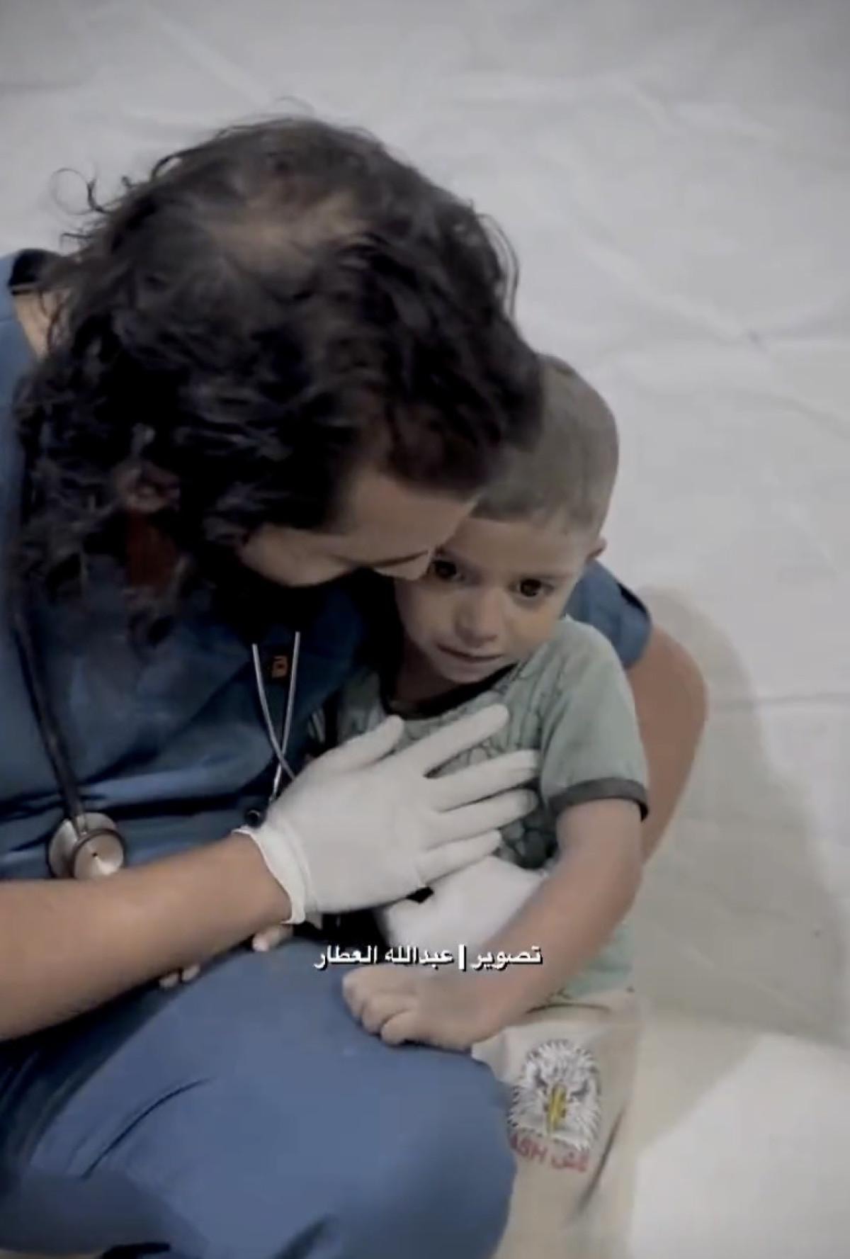 Filistinli bir doktor, titreyen çocuğu sarılarak sakinleştirmeye çalıştı.