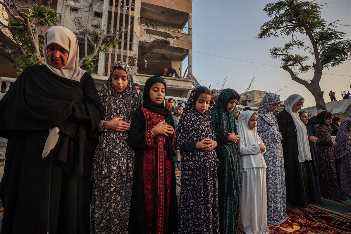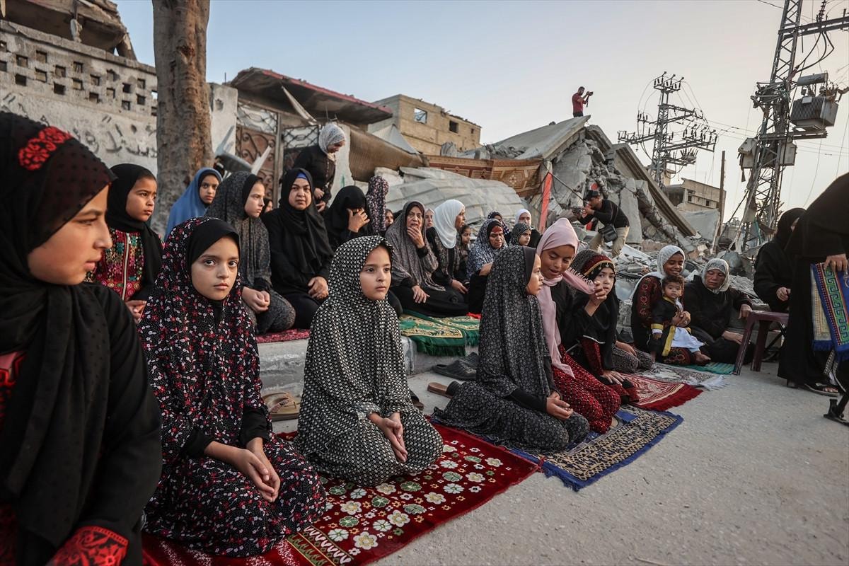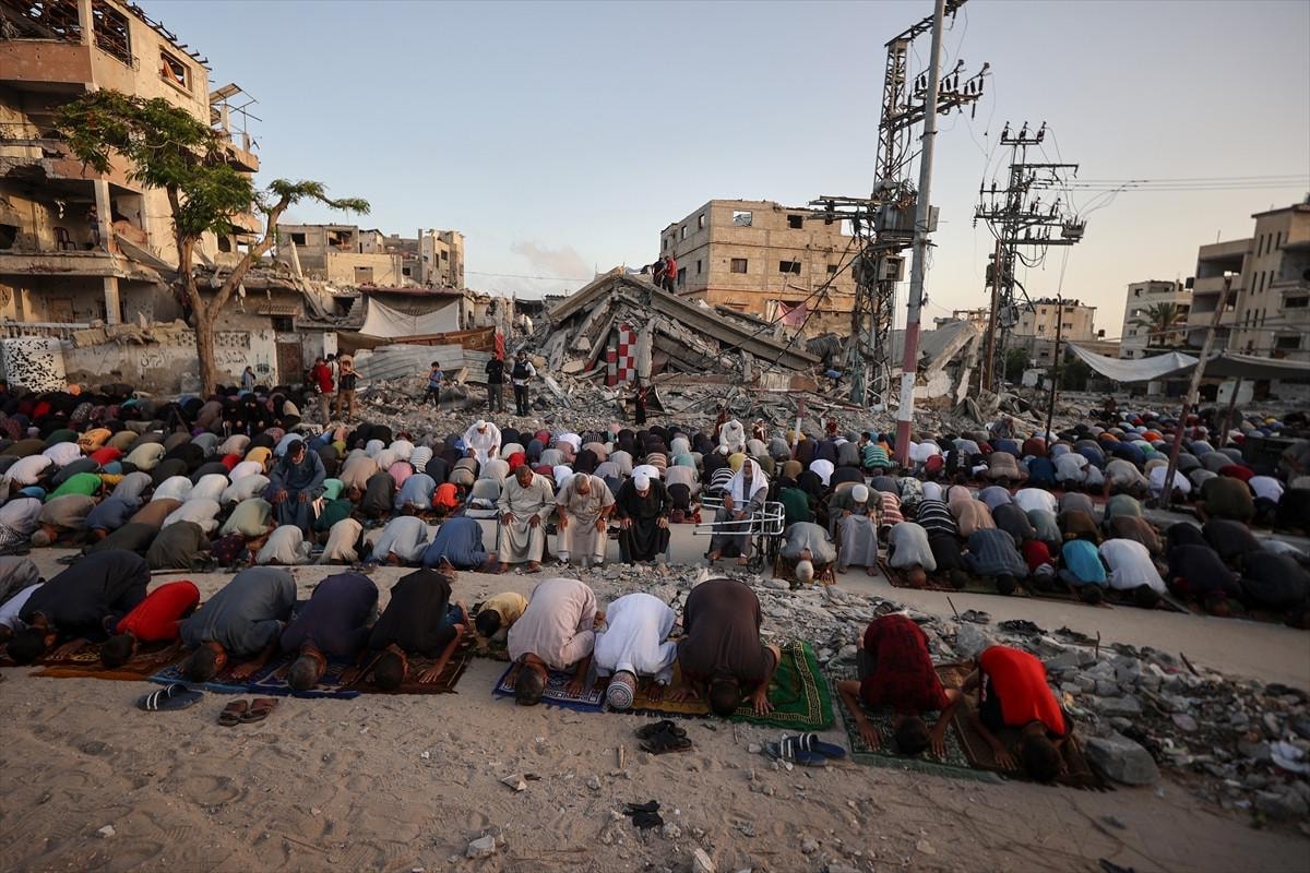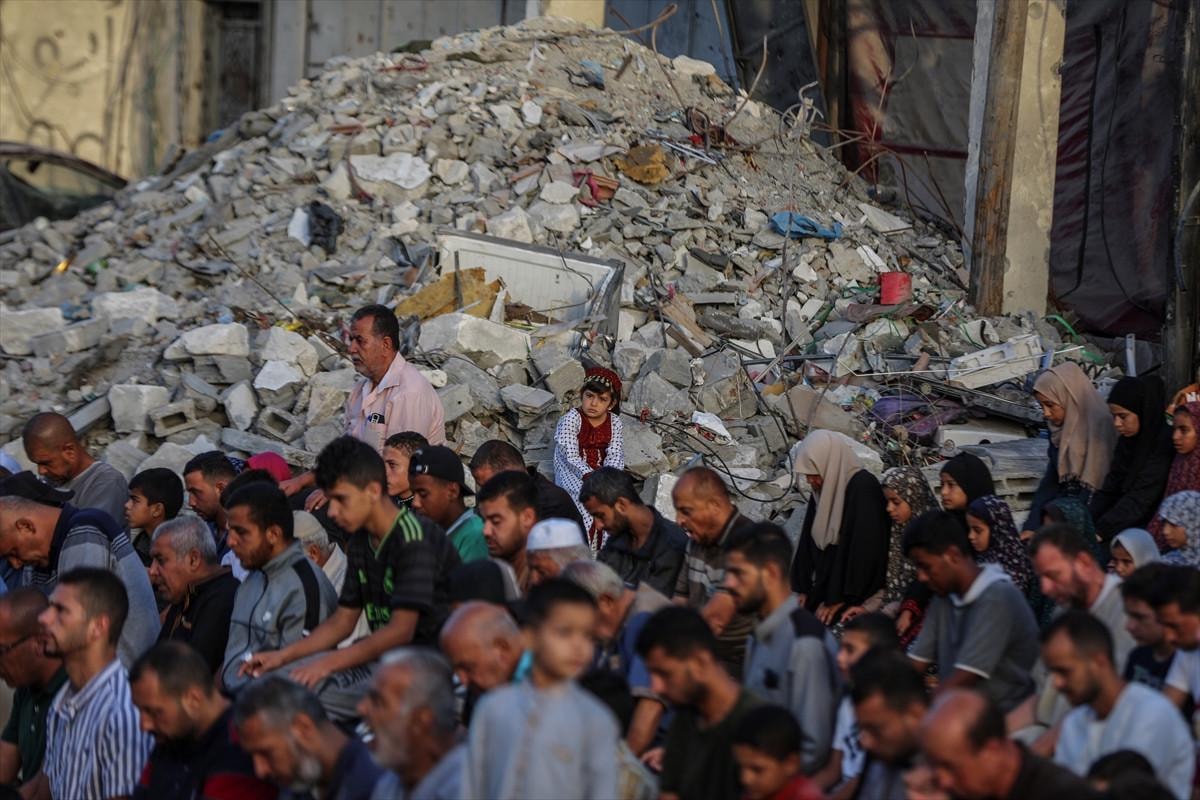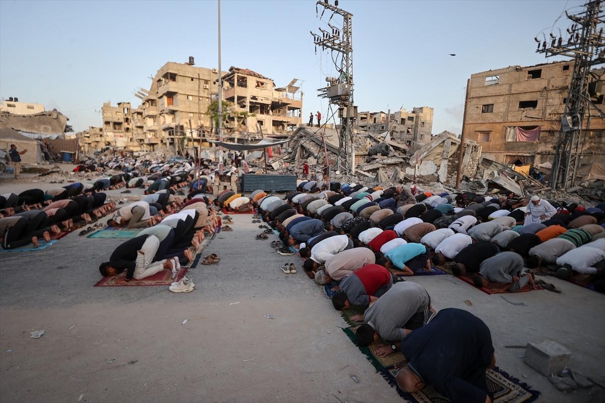 Gazze Şeridi'nin Han Yunus kentindeki Filistinliler, bayram namazını İsrail saldırıları sonucu yıkılan binaların enkazı üzerinde kıldı.