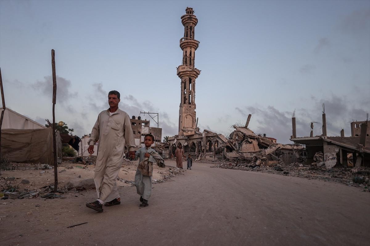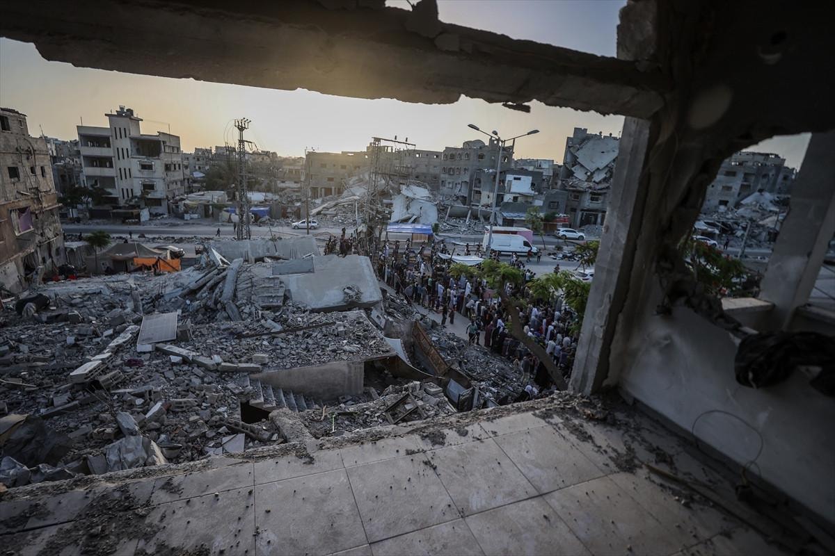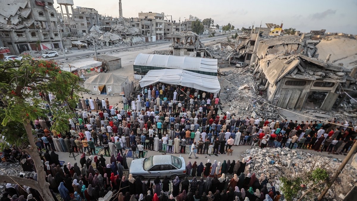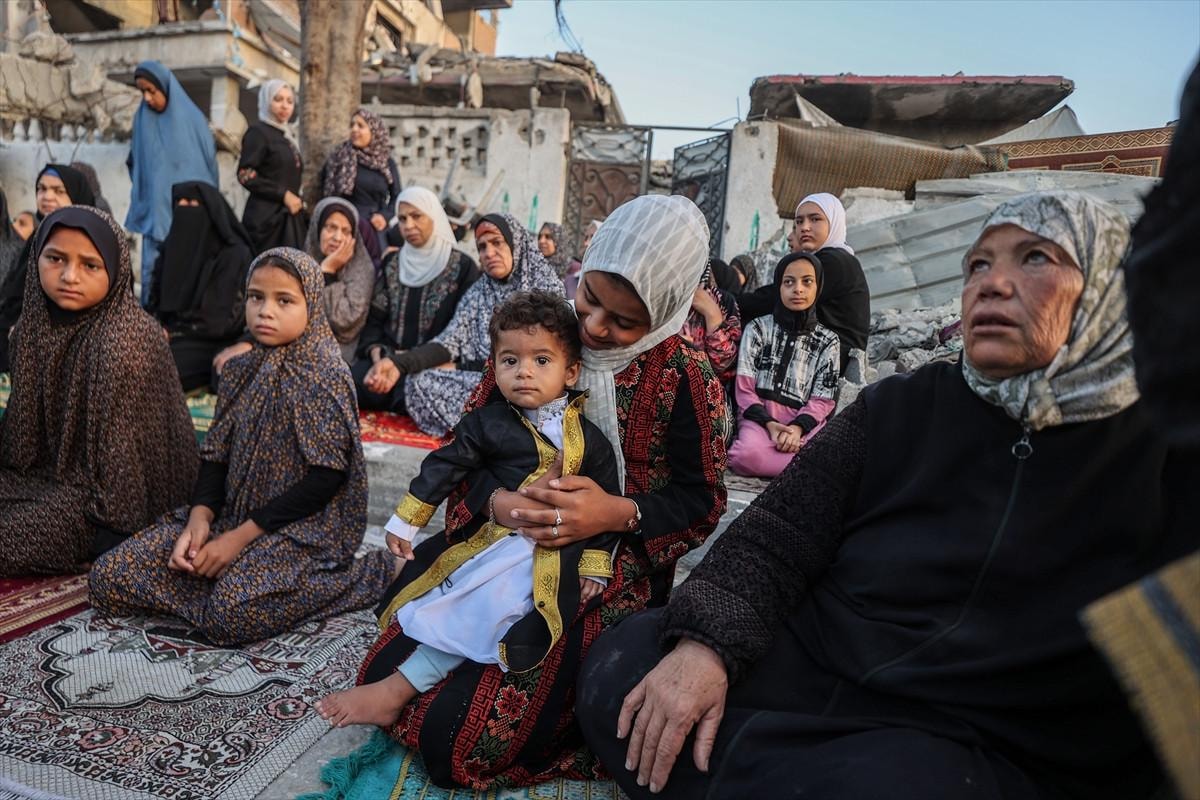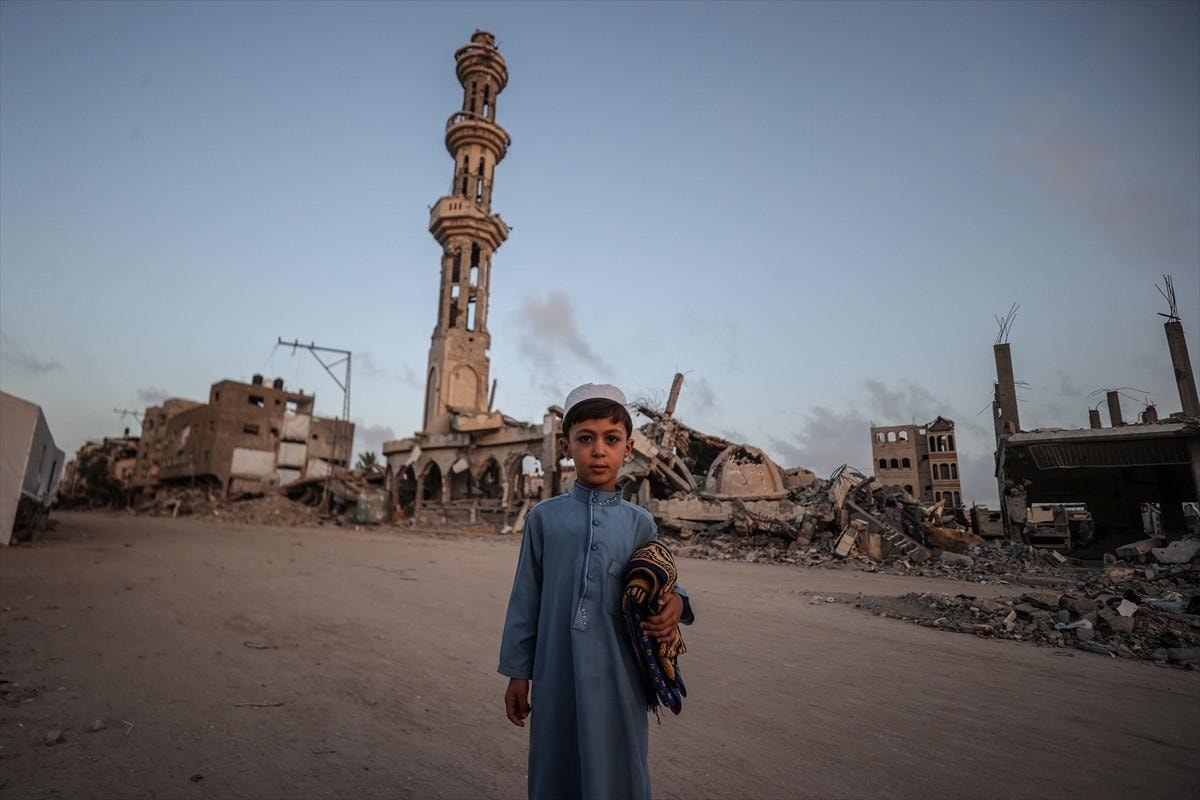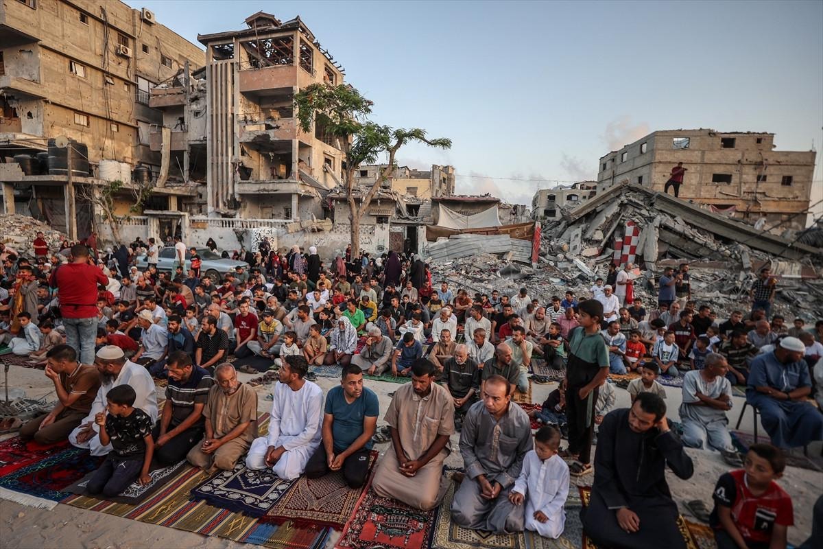 Gazze Şeridi'nin Han Yunus kentindeki Filistinliler, bayram namazını İsrail saldırıları sonucu yıkılan binaların enkazı üzerinde kıldı.