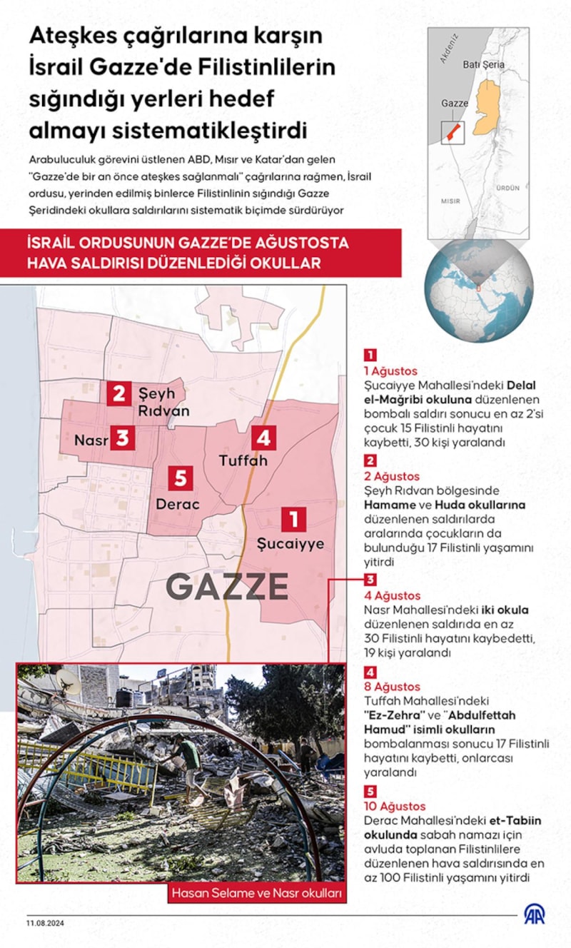 İsrail ordusu, zorla yerinden edilmiş binlerce Filistinlinin sığındığı Gazze Şeridi'ndeki okullara saldırılarını sistematik biçimde sürdürüyor.