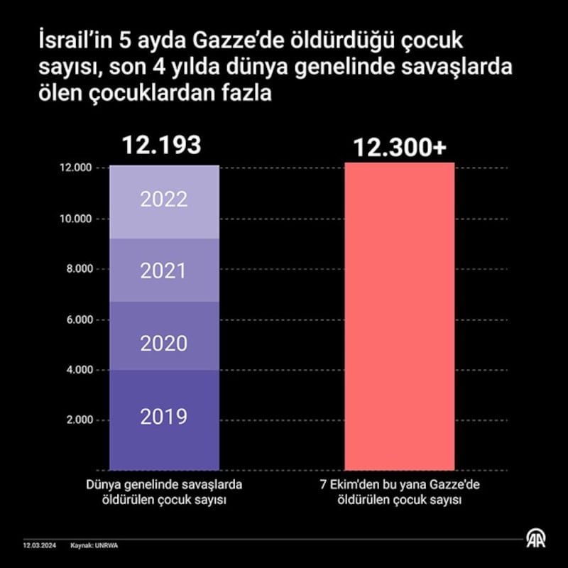 Grafikte, son 4 yıldaki savaşlarda öldürülen çocuk sayısı 12 bin 193 iken, Gazze'de öldürüldüğü bildirilen çocuk sayısı 12 bin 300'ün üzerinde olduğu aktarıldı.