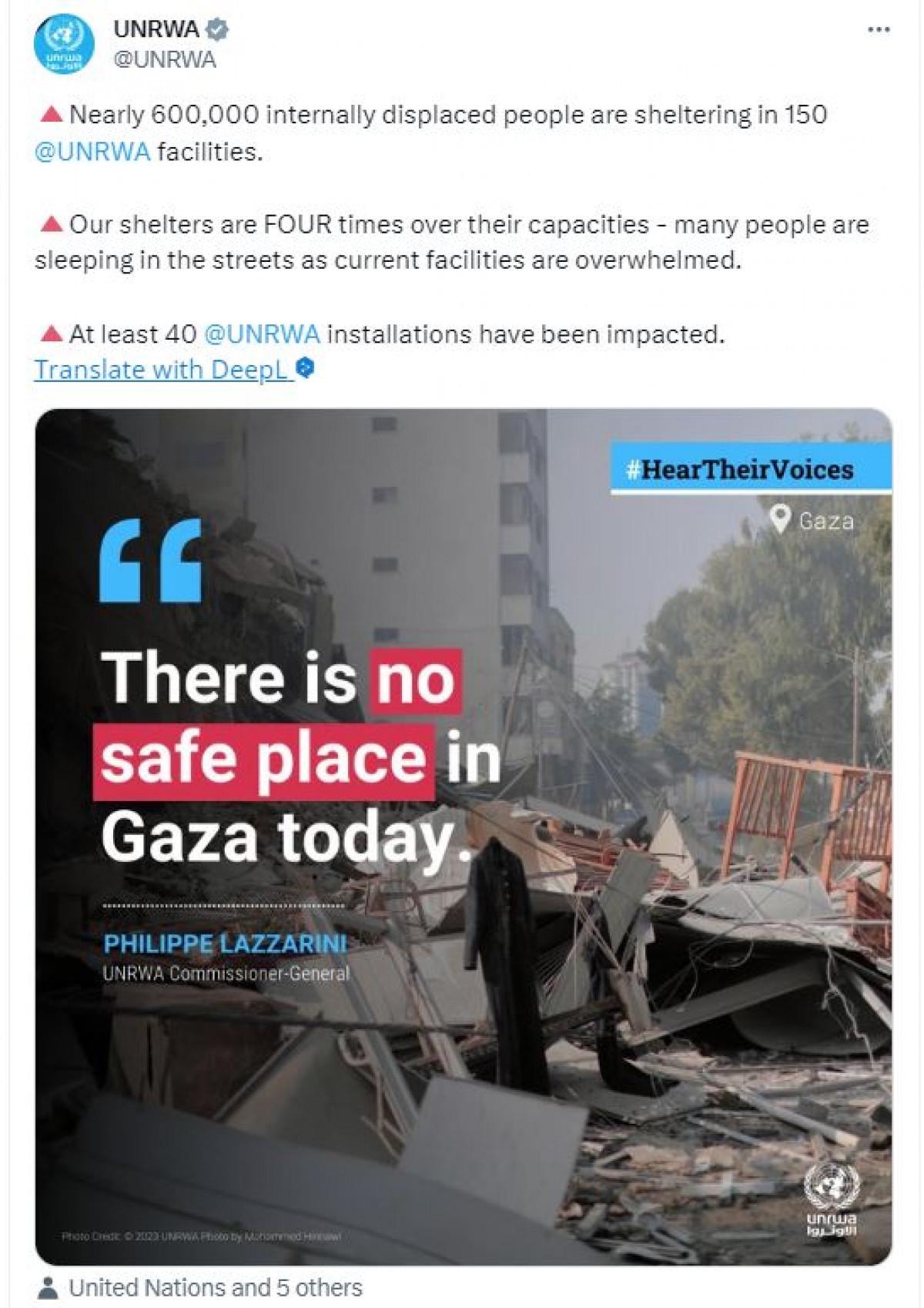 UNRWA’ya ait sosyal medya hesabı ise "Bugün Gazze'de güvenli bir yer yok" başlığıyla paylaşım yaptı.