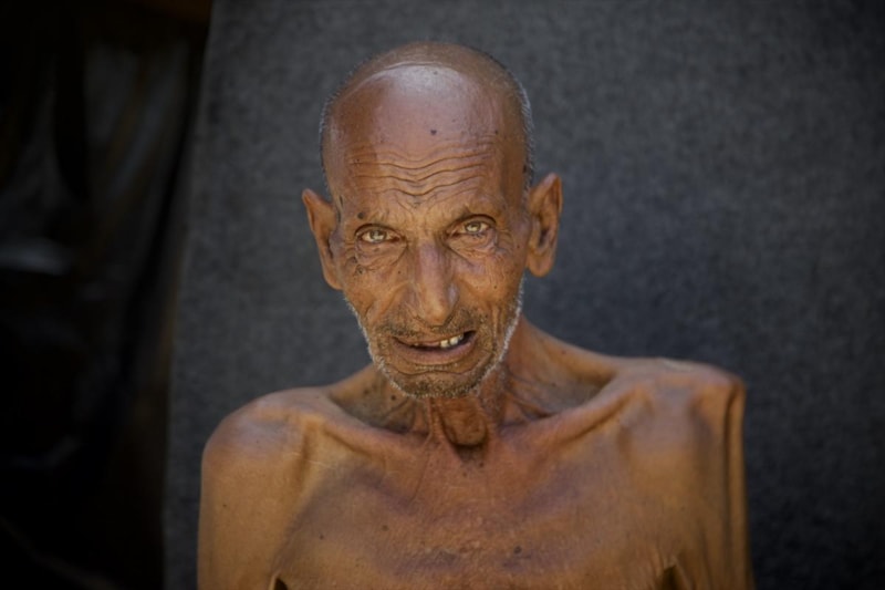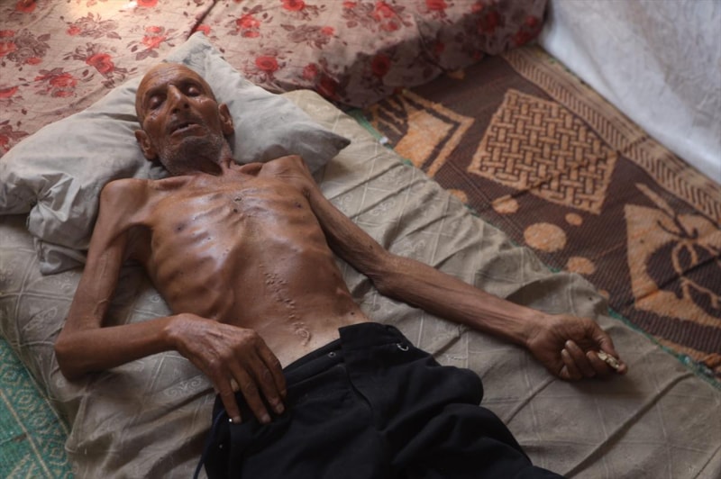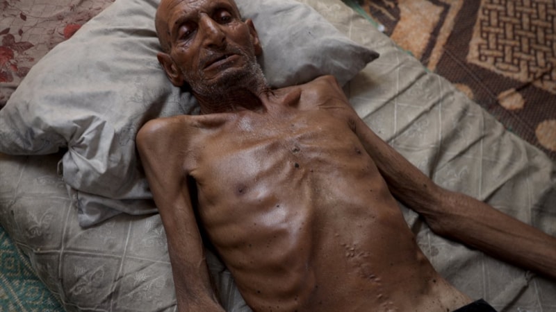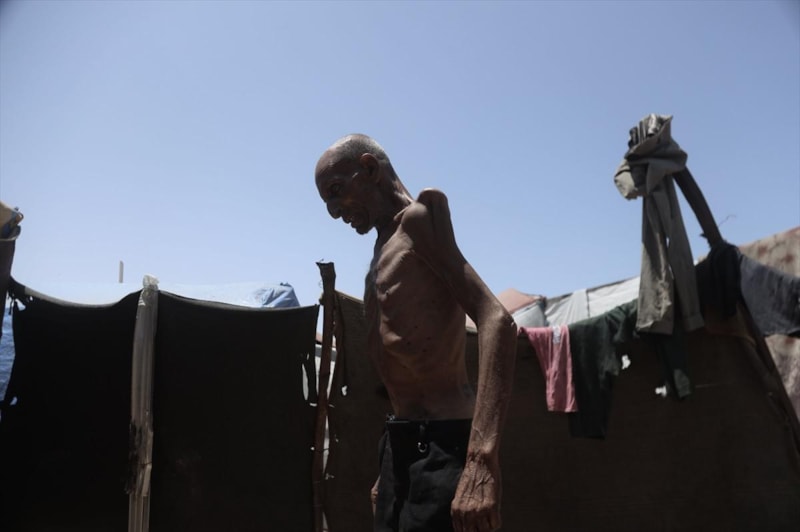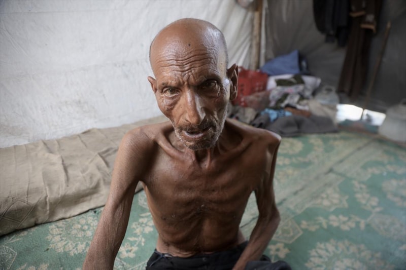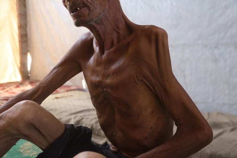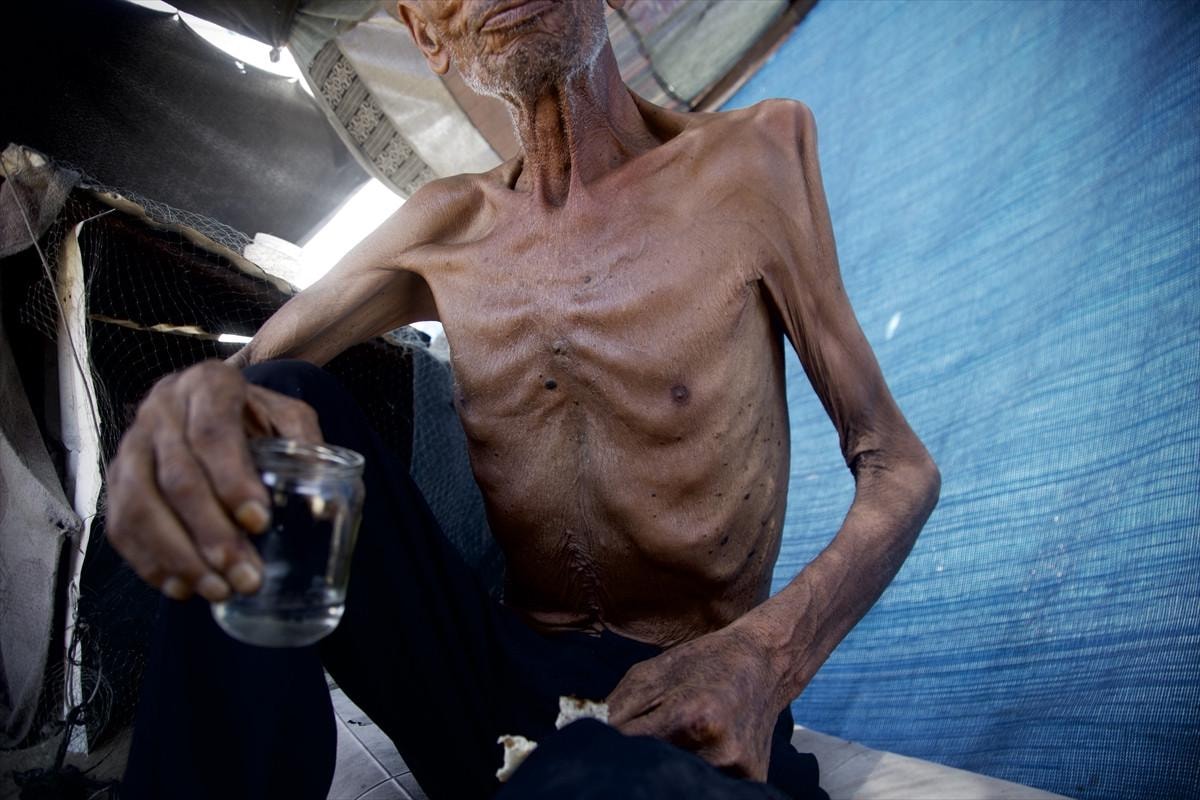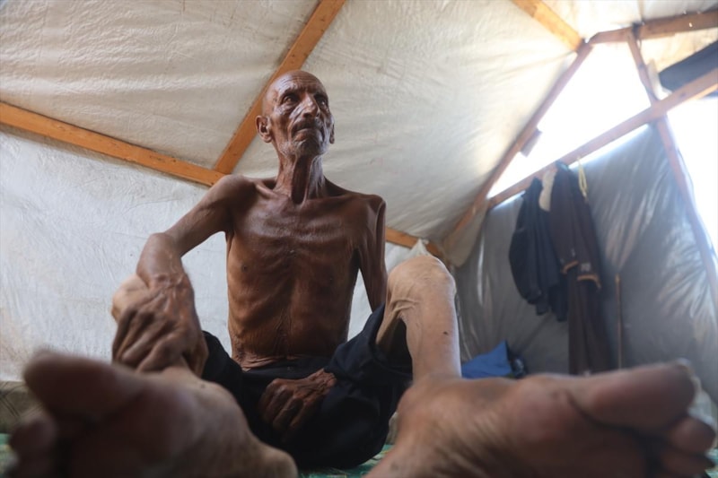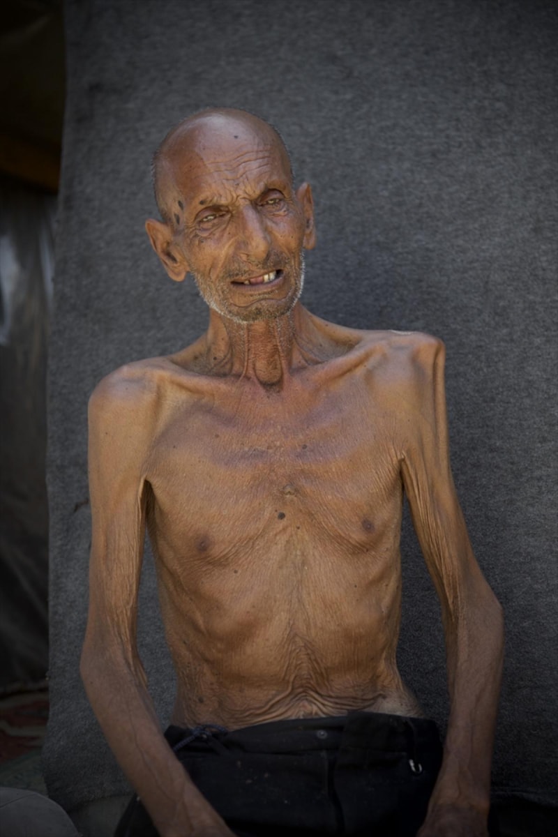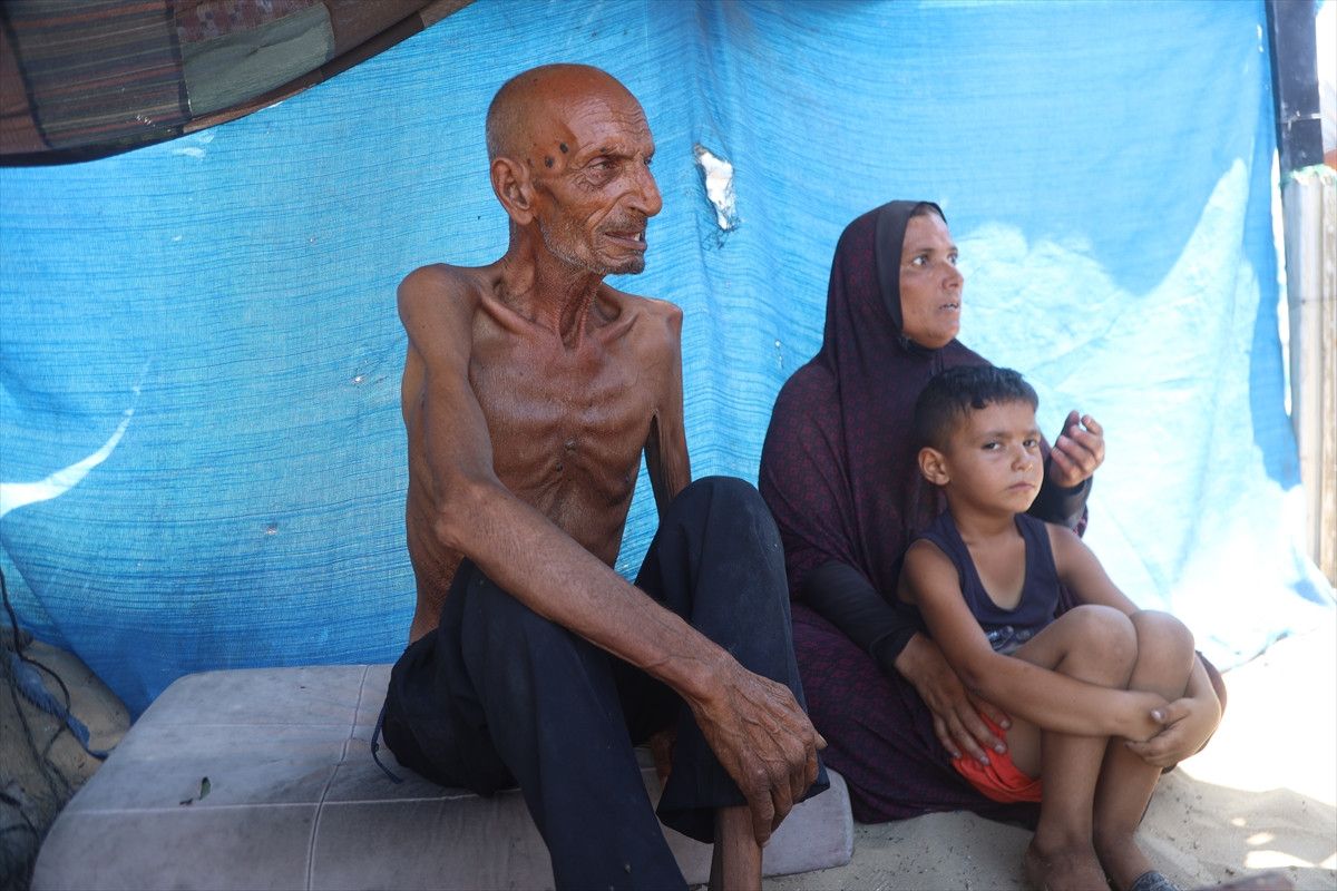 Gazze'nin Han Yunus kentinin batısında bir çadırda kalan ve zayıf bedeni adeta bir iskelete dönüşen 75 yaşındaki Selim Asfur, açlık nedeniyle ileri düzeyde kilo kaybı, halsizlik, hareket ve görme yetisinde bozulma belirtileri nedeniyle temel ihtiyaçlarını dahi destek almadan karşılayamaz halde.
