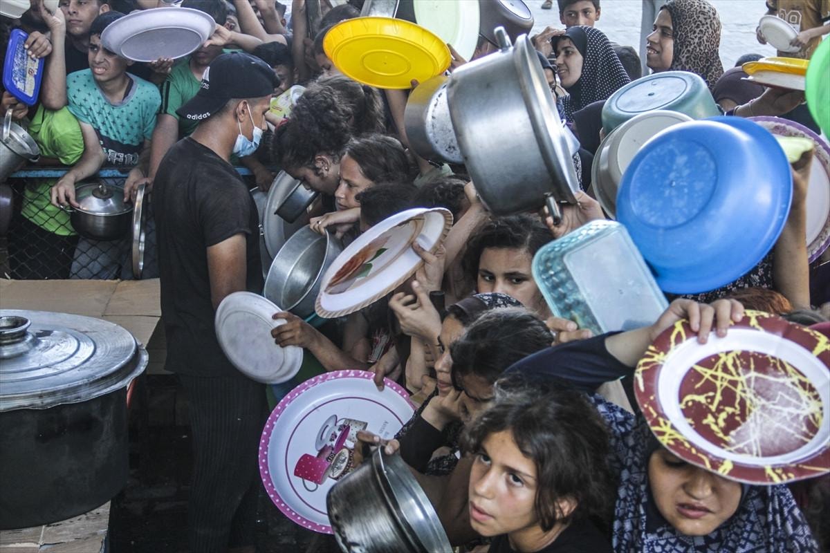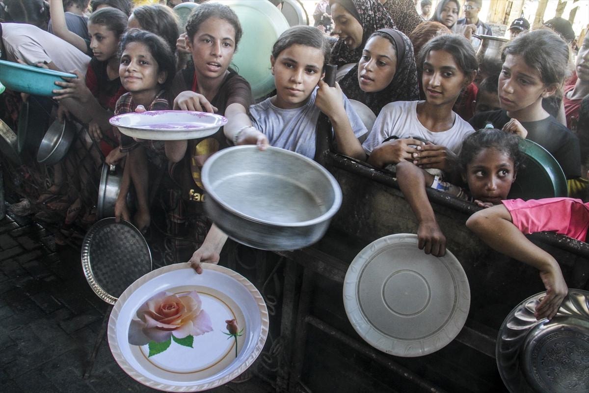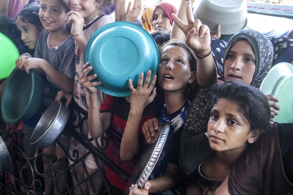 Binlerce çocuk elindeki tabaklarla, sıcak yemek alabilmek için çaresizce bekledi.