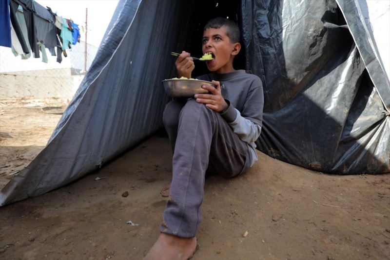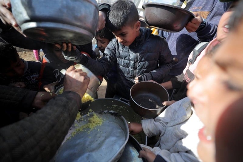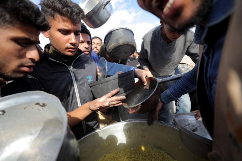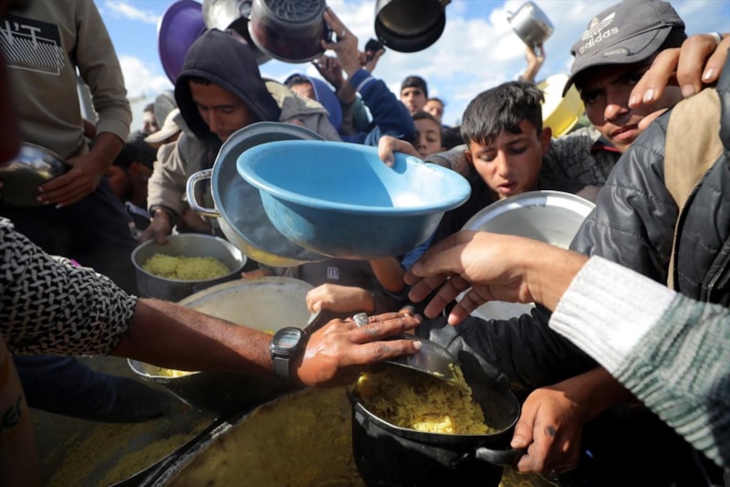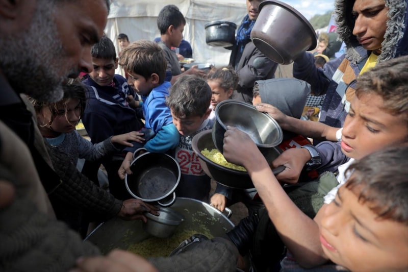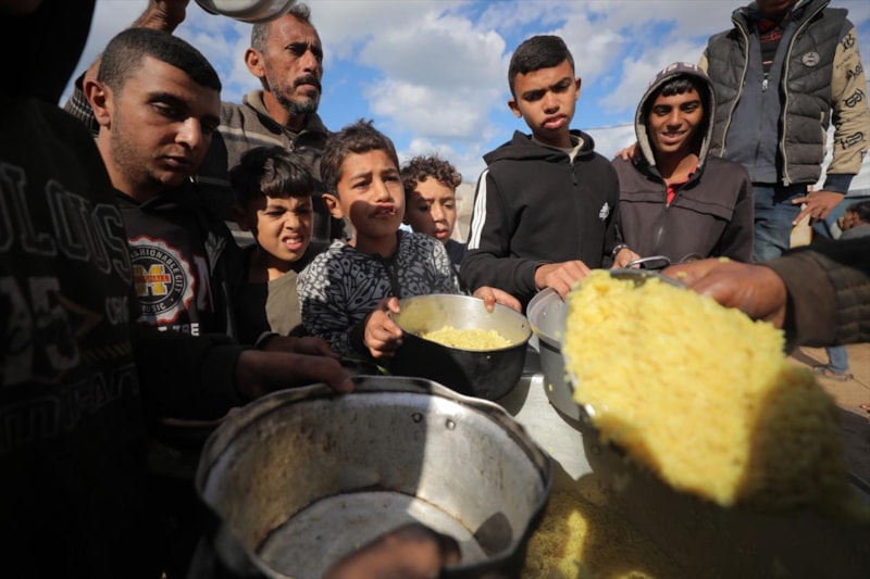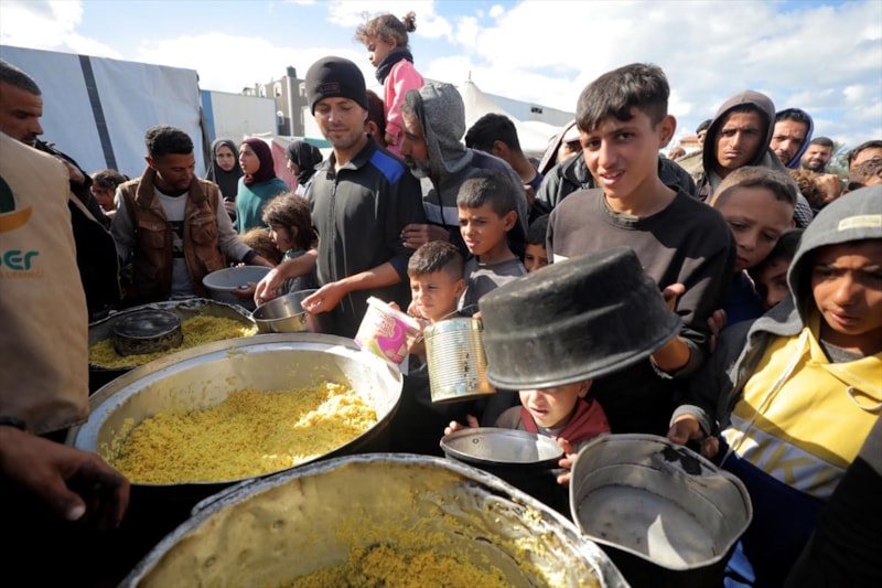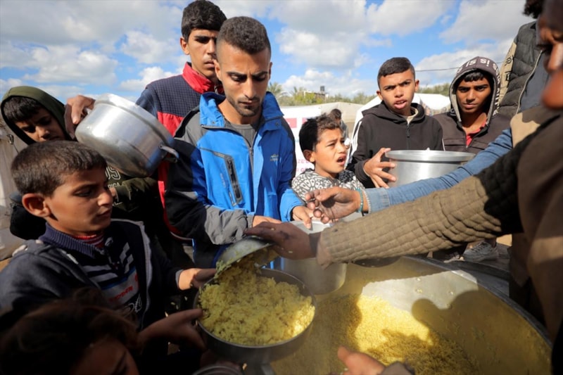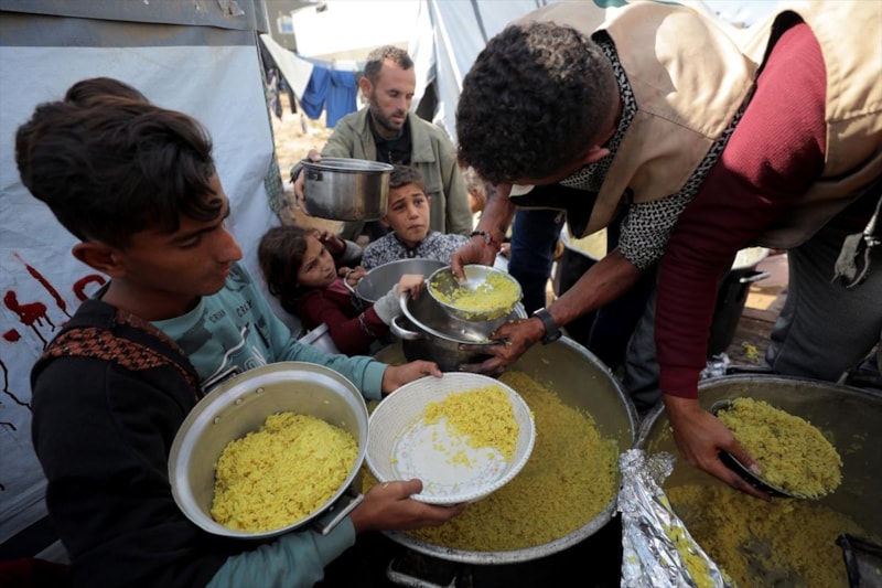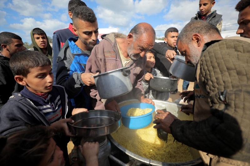 Gazze'nin orta kesimindeki Nusayrat Mülteci Kampı'ndaki yerinden edilmiş Filistinliler için sıcak yemek dağıtımı yapıldı. Aralarında çocukların da bulunduğu çok sayıda Filistinli, bir kap yemeğe ulaşabilmek için uzun kuyruklarda bekledi.