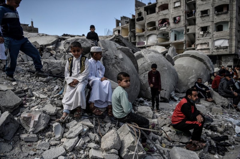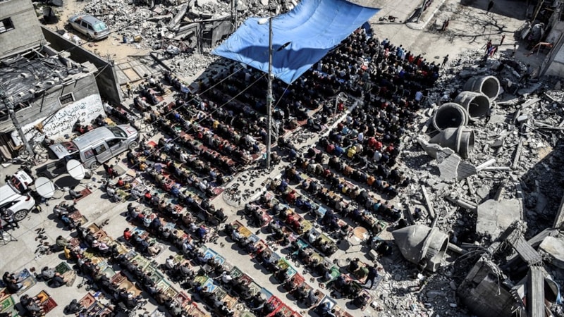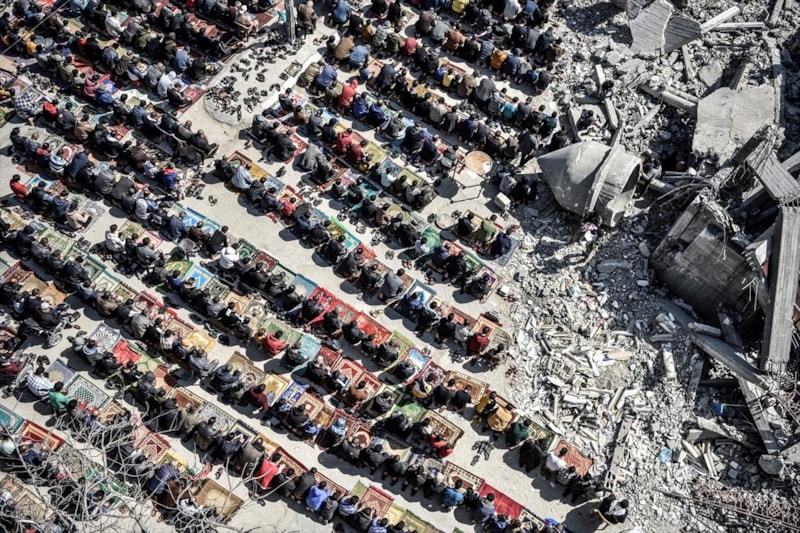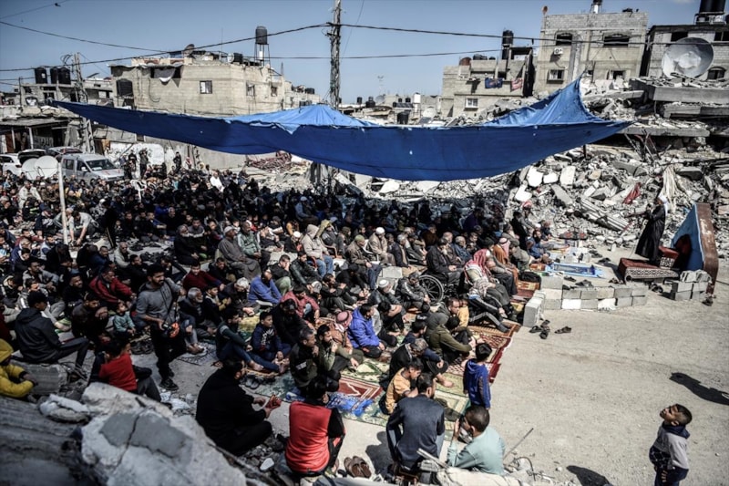 Gazze'nin Refah kentindeki Filistinliler, Ramazan ayı öncesindeki son cuma namazını İsrail saldırısında yıkılan Faruk Camii enkazında kıldı.