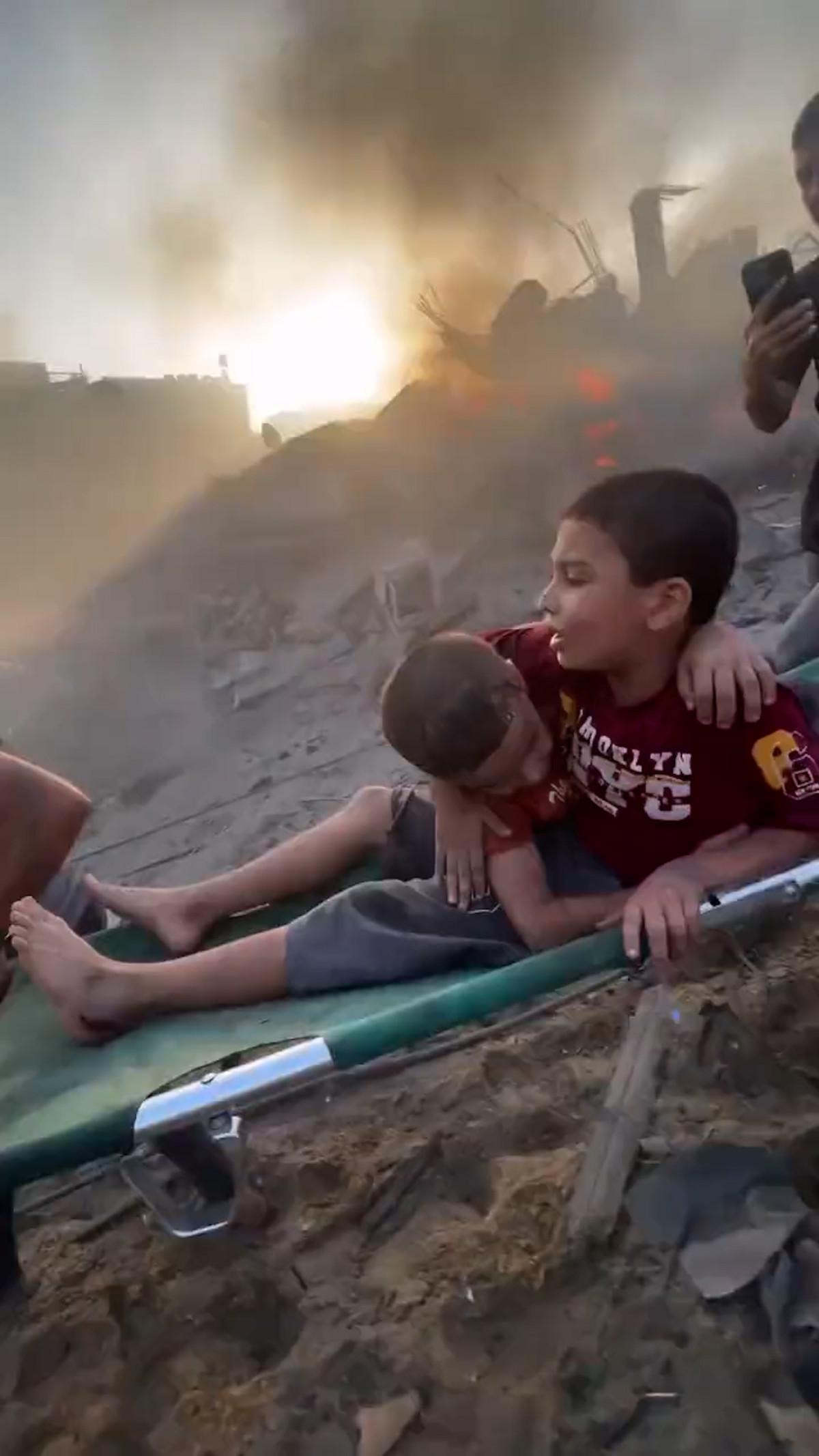 Bombardımana tutulan bölgeden sağ çıkarılan kardeşler, sedye ile taşındı.