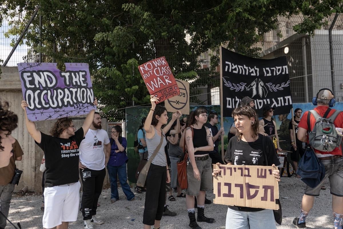 Askeri üssün önüne gelen İsrailli küçük bir grup, İsrail ordusunun Gazze'de işlediği insanlığa karşı suçlara ortak olmak istemedikleri için orduya katılmayı reddetme kararını bildirdikten sonra hapis cezası alacağı bilinen 2 İsrailliye destek vermek için gösteri düzenledi.