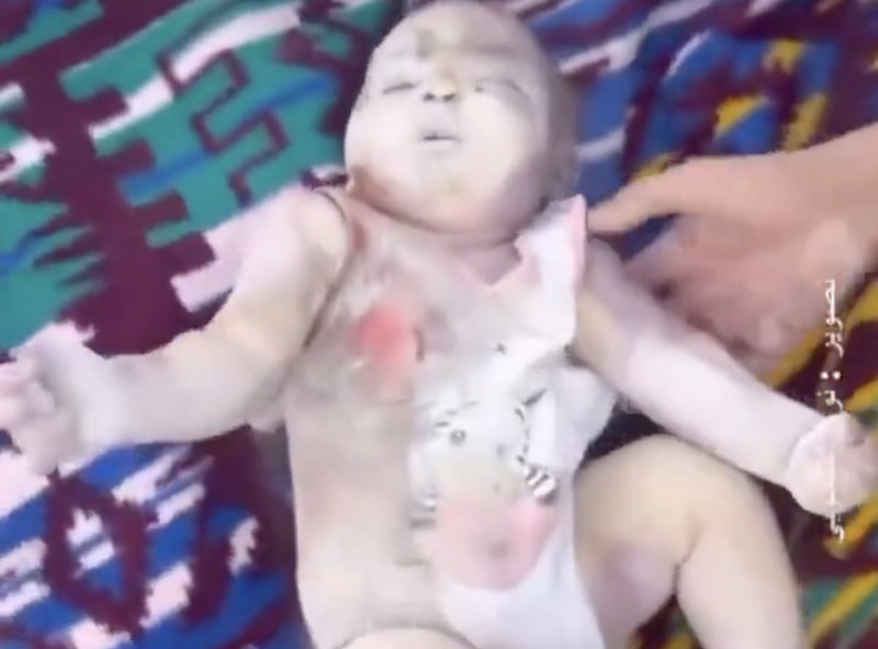 Görüntüde, çocuğun elinin defnedilmeden önce birçok kez kapatılmaya çalışıldığı, ancak son anlarında annesine sarıldığı için bu şekilde kaldığı belirtiliyor.