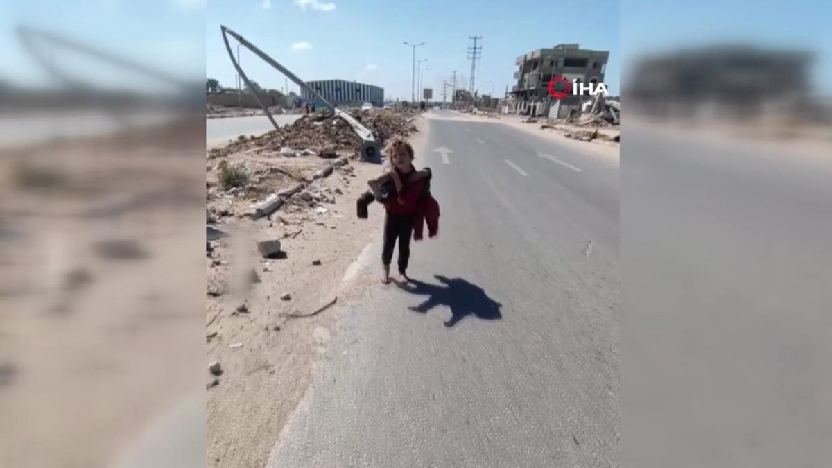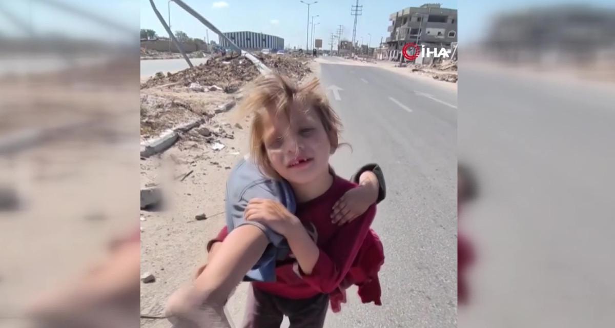 Küçük kız, görüntülerde kardeşinin bir kazada bacağından yaralandığını belirterek, “Çok yorgunum. Bir saattir kucağımda taşıyorum ve artık yürüyemiyorum.” ifadelerini kullandı.