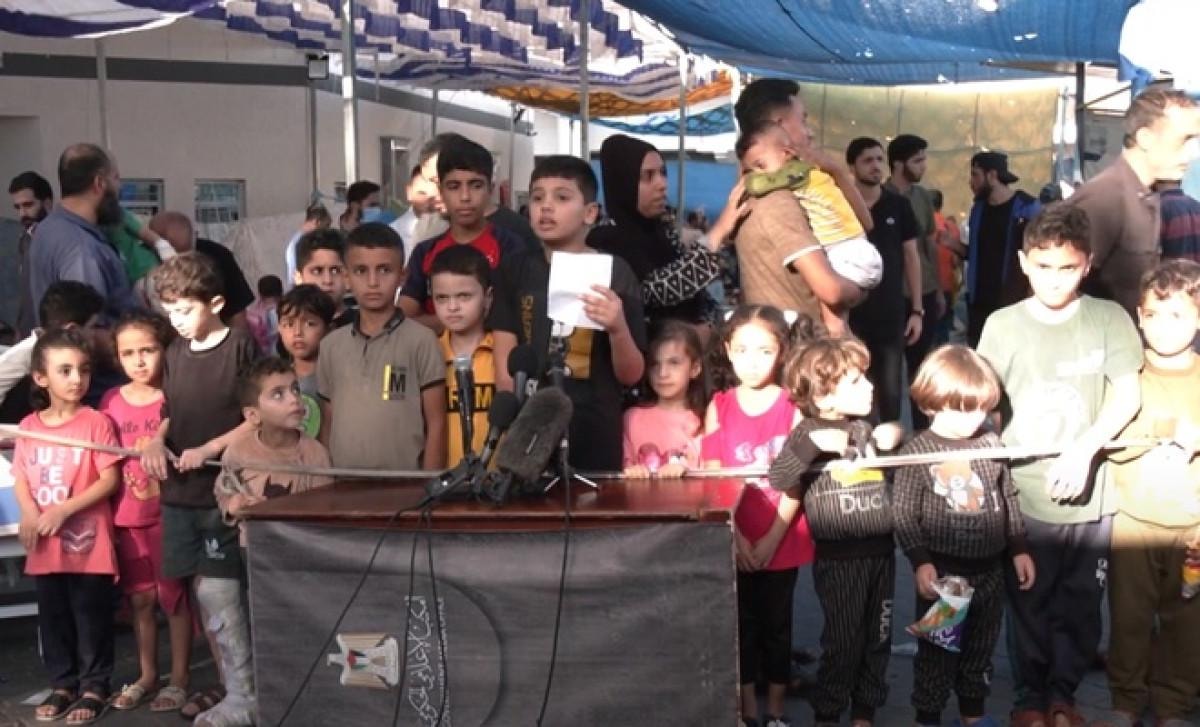 Dünyanın seyrettiği katliamda 7 Ekim'den bu yana Gazze'yi yerle bir edilirken bombardımandan kaçmak için Gazze'de bulunan Şifa Hastanesi'ne sığınan çocuklar, İsrail'in işgaline tepki gösteren bildiri okudu.
