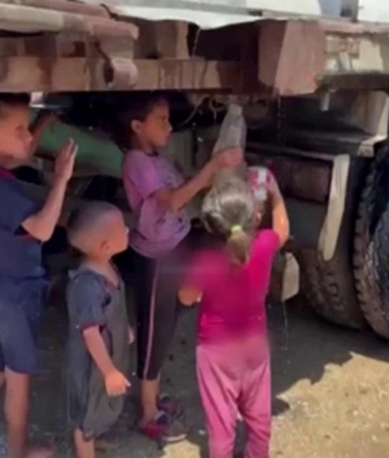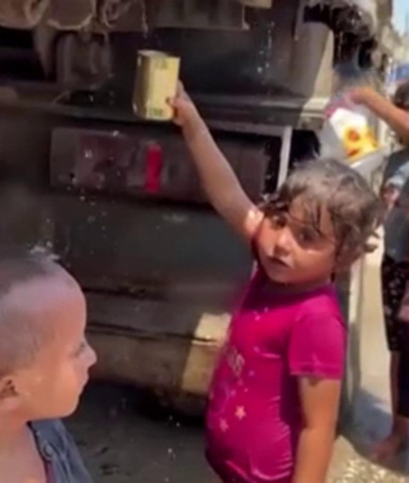 İsrail ablukasının devam ettiği, açlık ve susuzluğun sürdüğü Gazze Şeridi'nde çocuklar kamyondan akan kirli suyu ellerindeki kaplara doldururken görüldü.