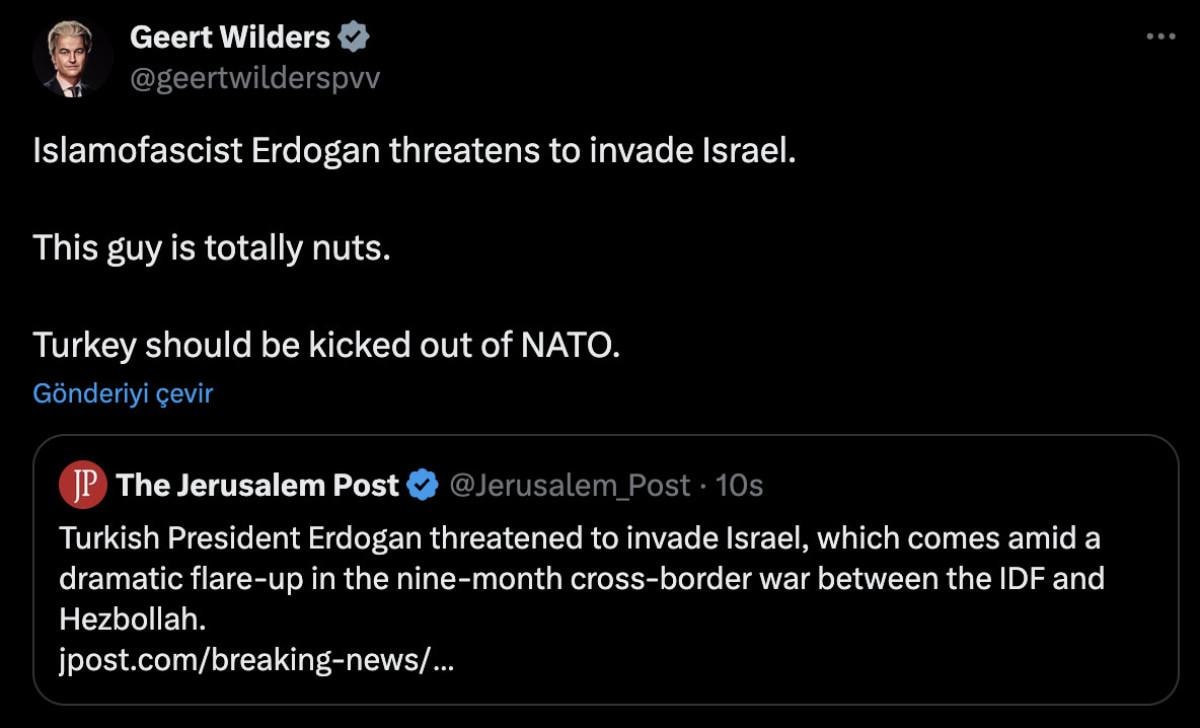 Wilders, X hesabından İsrail gazetesi The Jerusalem Post'un bir paylaşımını alıntılayarak Cumhurbaşkanı Erdoğan'a hakaret etti.