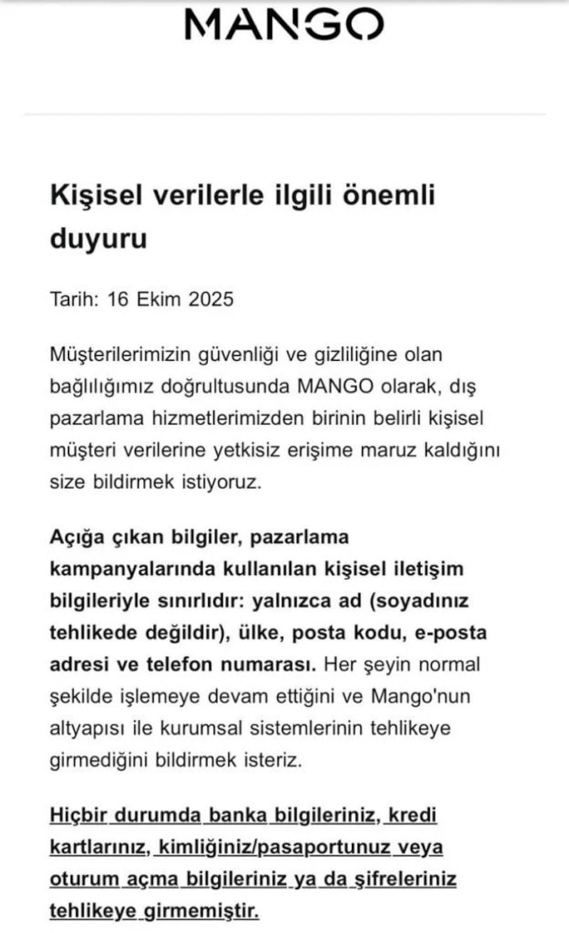 “Hizmetlerimizin güvenliğine olan bağlılığımız doğrultusunda, dış pazarlama hizmetlerimizden birinde belirli kişisel verilerin yetkisiz erişime maruz kaldığını tespit ettik. Ancak finansal veriler ve giriş bilgileri güvende. Mango altyapısı ve sistemleri saldırıdan etkilenmemiştir.”