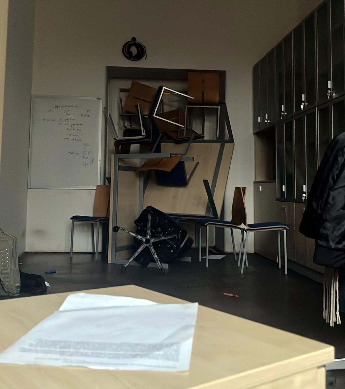 Şu anda Prag'daki sınıfımda sıkıştım kaldım. Saldırgan öldü ama tahliye edilmeyi bekliyoruz. Kapıyı, saldırgan açmaya çalışmadan önce kilitledim. Lanet olsun.