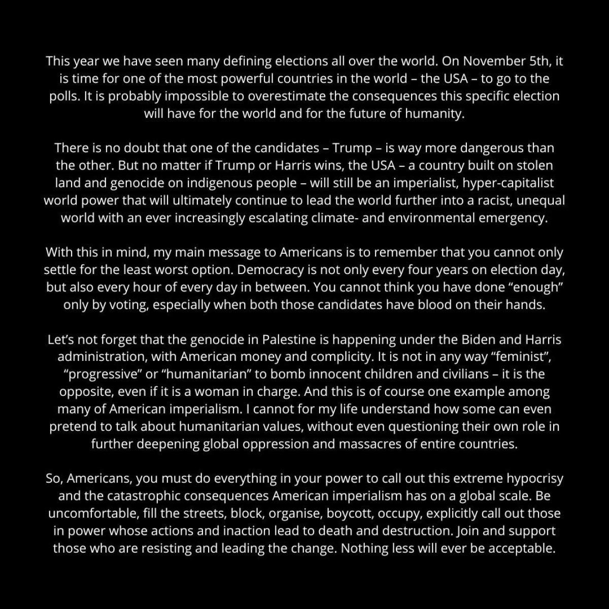 Thunberg açıklamasında her iki adayı da eleştirerek, “Trump'ın Harris’ten çok daha tehlikeli olduğuna şüphe yok. Ancak kim kazanırsa kazansın çalınmış topraklar ve yerli halklara yönelik soykırım üzerine kurulu bir ülke olan ABD, yine de emperyalist, aşırı kapitalist bir dünya gücü olacak. Dünyayı giderek artan bir çevre acil durumuyla ve eşitsiz bir dünyaya doğru götürmeye devam edecek.” dedi.