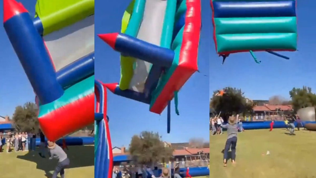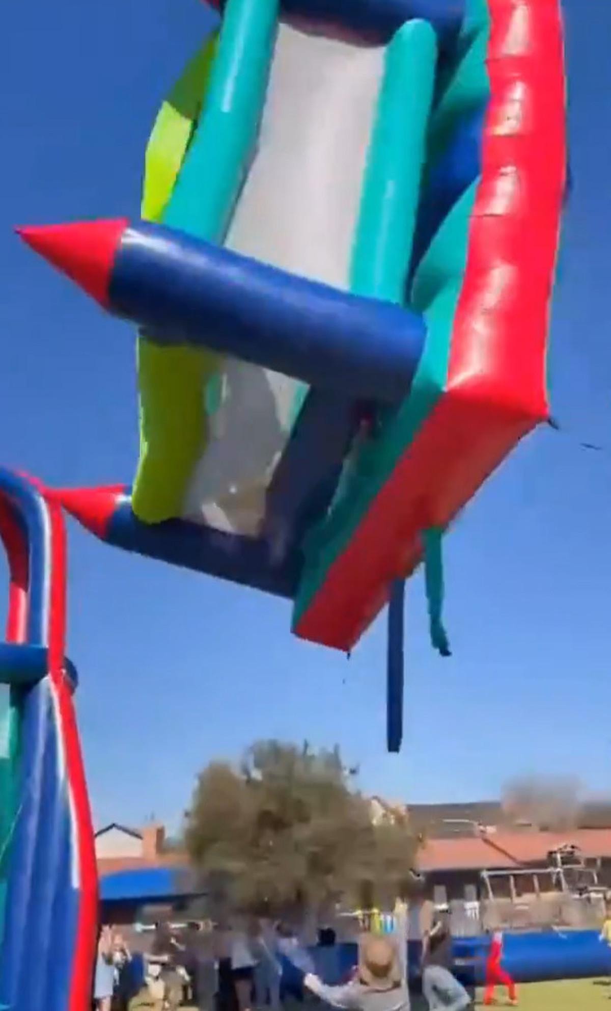 Krugersdorp kentinde şiddetli rüzgar ortalığı birbirine kattı. Kentteki bir okulda düzenlenen yardım etkinliği sırasında çocukların bulunduğu şişme oyun alanı ani bir rüzgarla havaya savruldu.