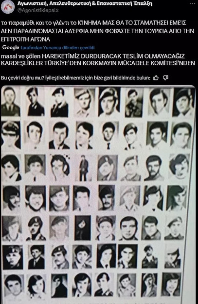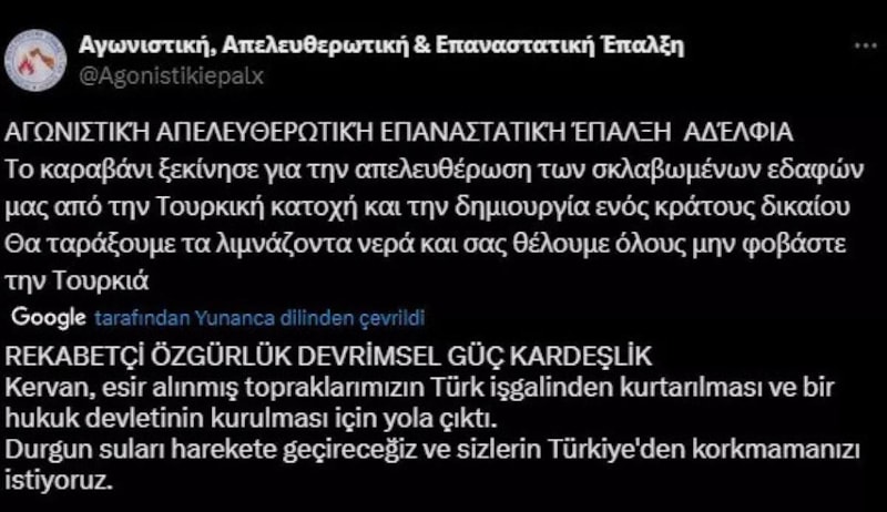 "Devrimci Özgürlük Savaşçıları Hareketi" adını taşıyan örgüt, Twitter (X) hesabında yaptığı paylaşımlarda, Yunanlıların Türklere karşı başkaldırısını simgeleyen "Ateş ve Balta" figürlerini sembol olarak kullandı.