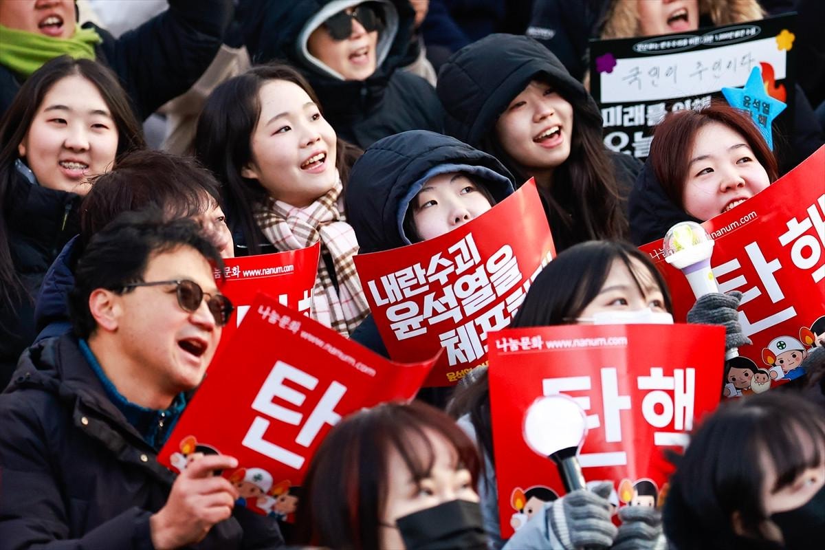 Kimileri dans edip elindeki "Yoon görevden alınsın" pankartını salladı, kimi ise mutluluk gözyaşları döktü.