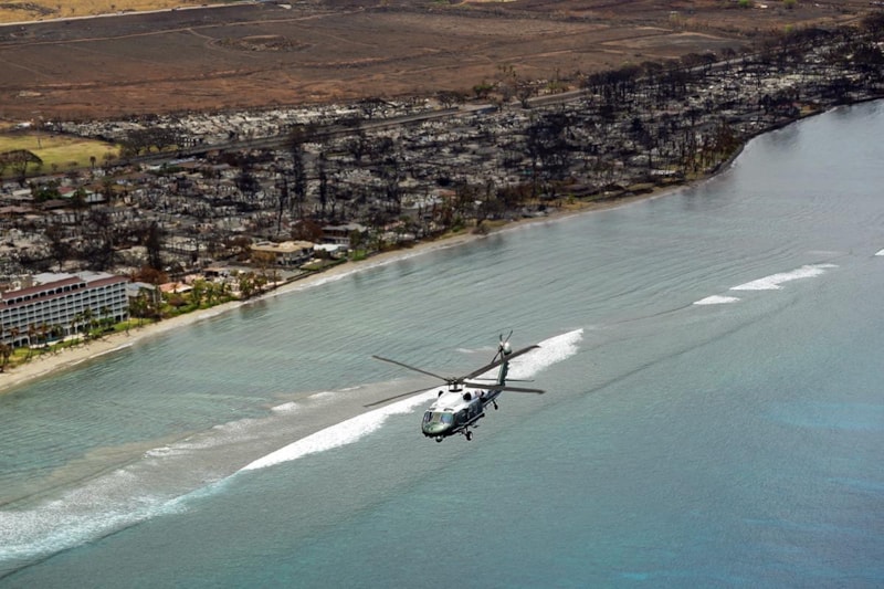 ABD Başkanı, eşi Jill Biden ile birlikte, yangında zarar gören bölgeyi helikopterle havadan inceledi.