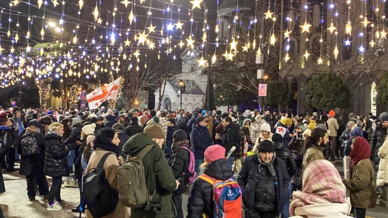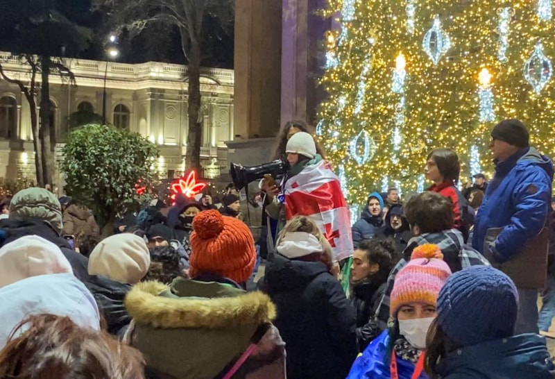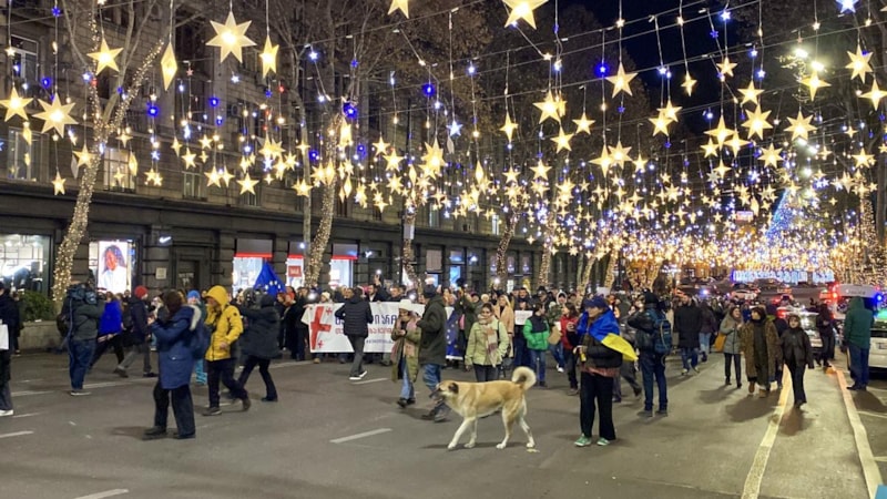Başkent Tiflis’te yaklaşık bir aydır her gün parlamento binası önünde toplanan kalabalık, Gürcistan'ın AB müzakerelerini askıya almasını ellerinde Gürcistan ve AB bayrakları ile protesto etti.