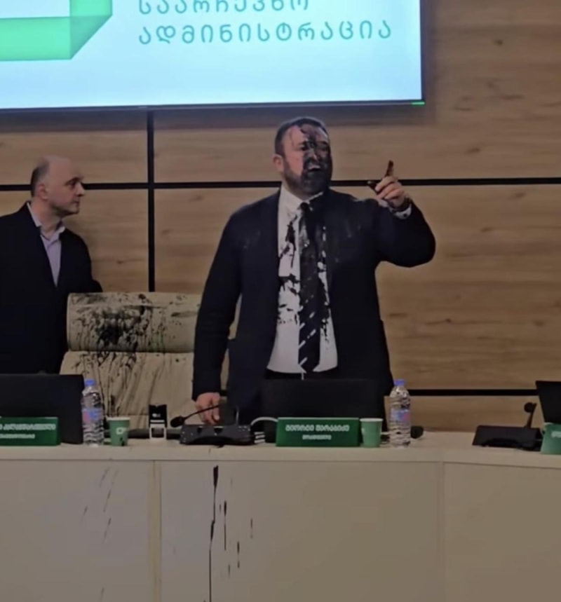 Eski Cumhurbaşkanı Mihail Saakaşvili'nin partisi Birleşik Ulusal Hareket'in temsilcisi Davit Kirtadze, sonuçlar açıklanmadan önce MSK Başkanı Kalandarişvili'ye yaklaşarak "Sen kara bir lekesin" deyip siyah boya fırlattı.