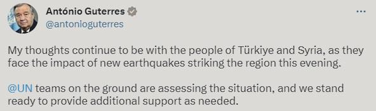 Düşüncelerim, bölgeyi vuran yeni depremlerin etkisiyle karşı karşıya kalan Türkiye ve Suriye halklarıyla birlikte olmaya devam ediyor. Sahadaki BM ekipleri durumu değerlendiriyor. Gerekirse ek destek sağlamaya hazırız.