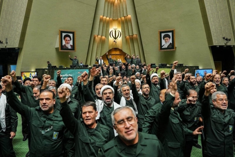 Mecliste Devrim Muhafızları Ordusu askeri kıyafetleriyle yerlerini alan milletvekilleri ABD ve AB karşıtı sloganlar attılar.