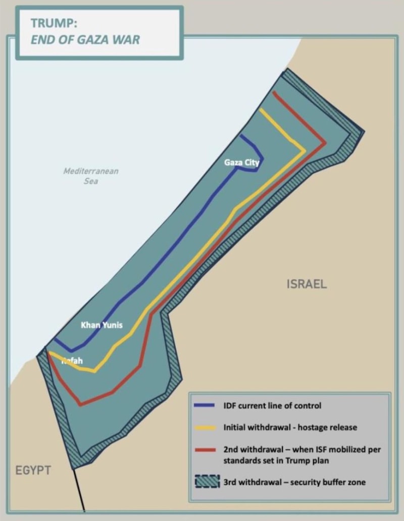 17) Eğer Hamas bu teklifi geciktirir veya reddederse yukarıdaki maddeler terörden arındırılmış bölgelerde uygulanacak ve bu bölgeler İsrail ordusu tarafından kademeli olarak uluslararası istikrar gücüne devredilecek.