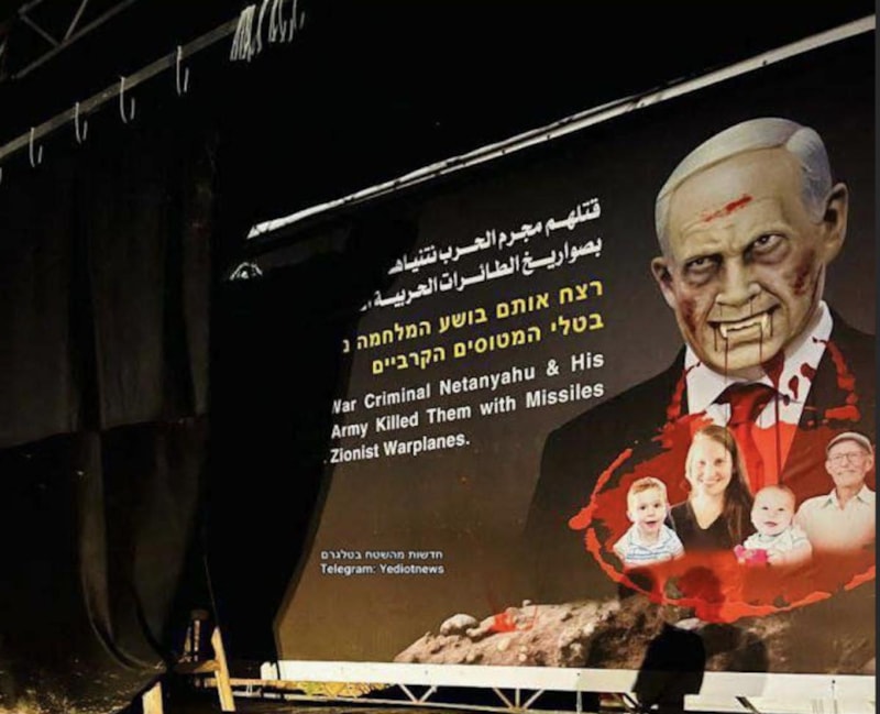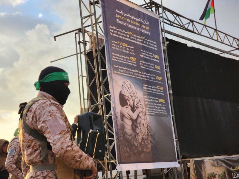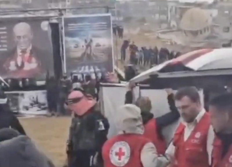 Hamas, esir takası kapsamında, İsrailli Oded Lifshitz ile Bibas ailesine ait 3 cenazeyi Kızılhaç’a teslim etti. Törenin arka planında ise, İsrail Başbakanı Netanyahu'nun vampir olarak tasvir edildiği dikkat çeken bir poster yer aldı.