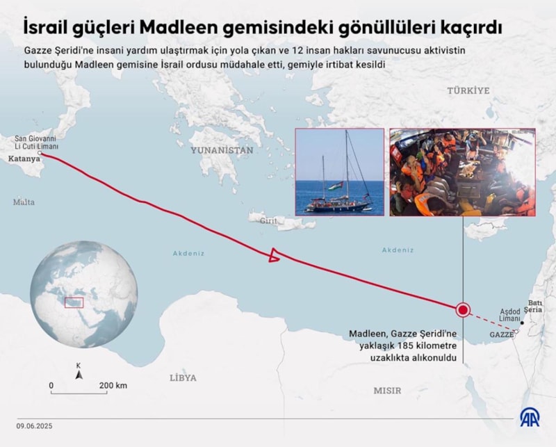 "Özgürlük Filosu Koalisyonu" adlı sivil toplum kuruluşunun Gazze'ye yönelik ablukayı kırıp bölgeye yardım götürme amacıyla düzenlediği son misyon çerçevesinde 18 metrelik Madleen gemisi, 1 Haziran'da İtalya'nın Katanya kentindeki San Giovanni Li Cuti Limanı'ndan Gazze için yola çıkmıştı.