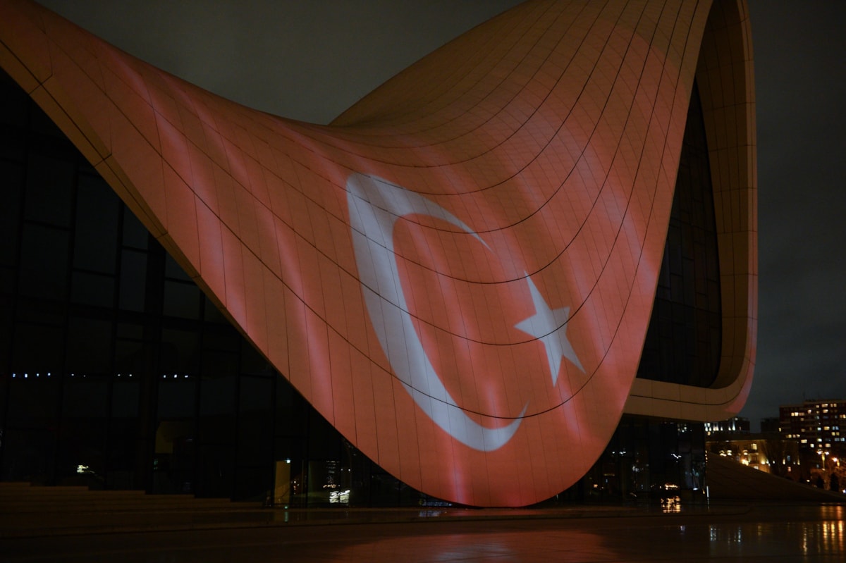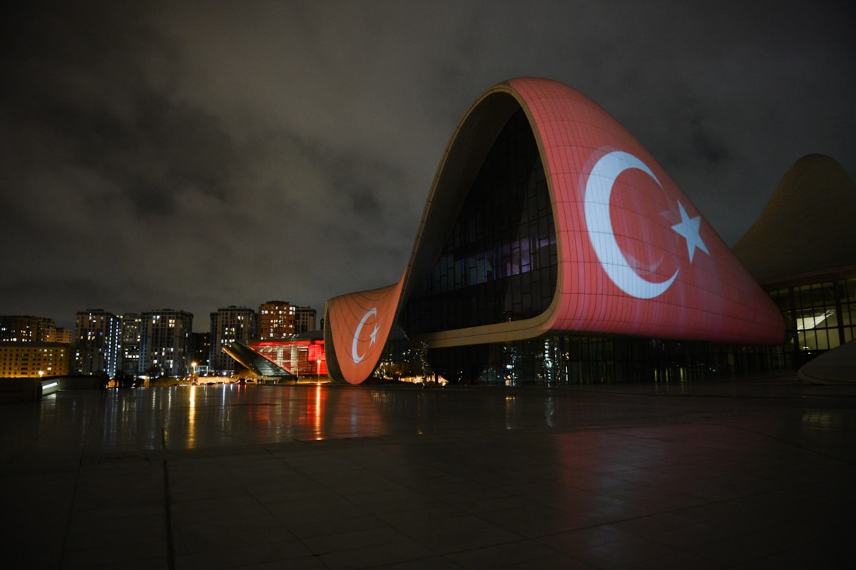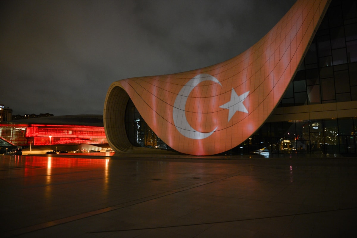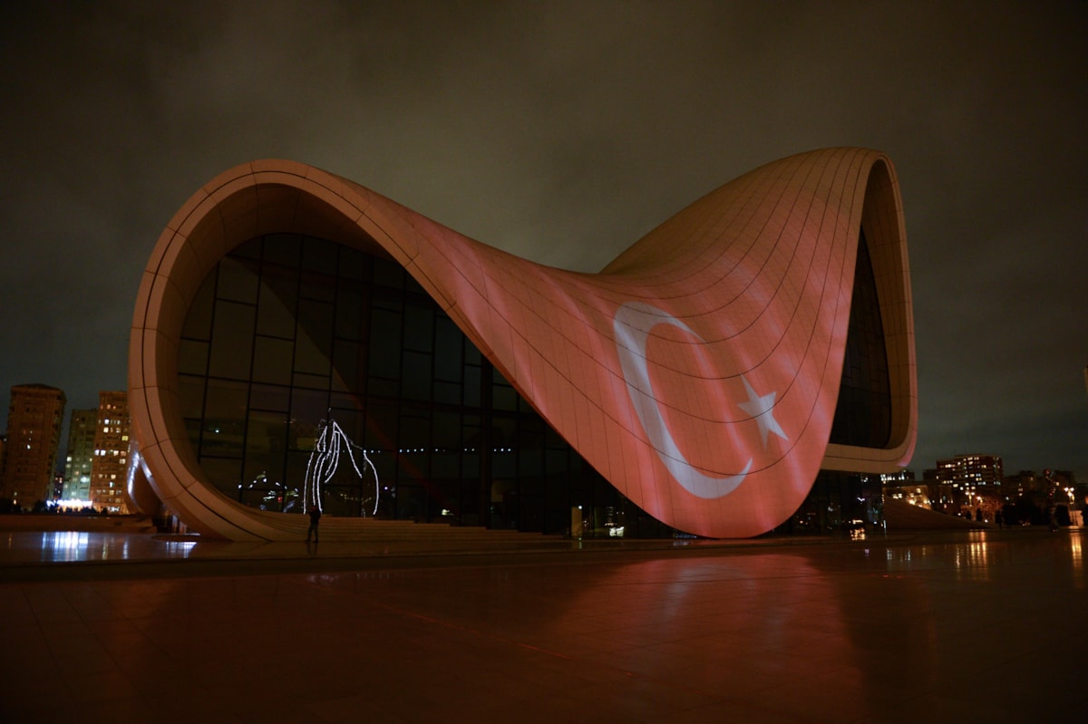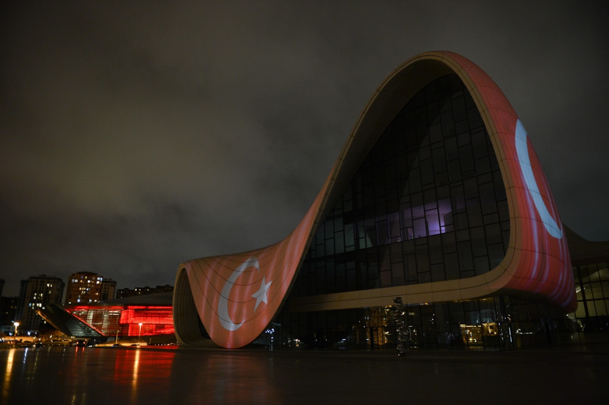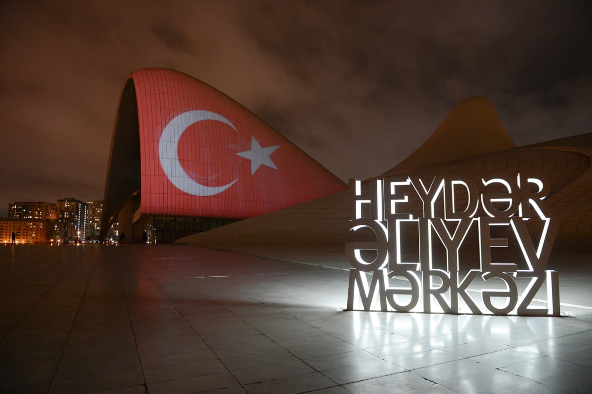 Azerbaycan’ın en önemli sembollerinden biri haline gelen başkent Bakü’deki Haydar Aliyev Merkezi’ne Türkiye’ye destek amacıyla Türk bayrağı silüeti yansıtıldı.
