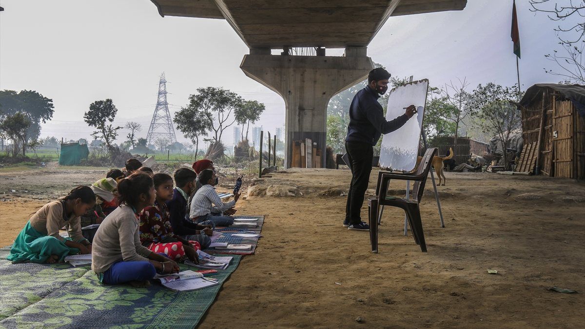 Hindistan’ın başkenti Yeni Delhi’de çevrimiçi dersleri karşılayamayan yoksul ailelerin çocukları, açık havada bir araya geliyor.