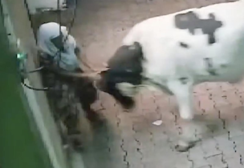 Hindistan'ın Sambhal kentinde başıboş bir inek, evinin önünde oturan yaşlı bir kadına saldırdı. Güvenlik kamerasına yansıyan olayda kadının kolu kırıldı, vücudunda ciddi kırıklar oluştu.