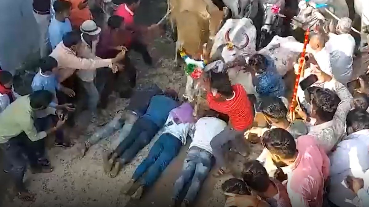 Önce Hintler yere yattı. Sonrasında ise inekler, çalgılar eşliğinde yere yatanların üzerine basıp geçti.