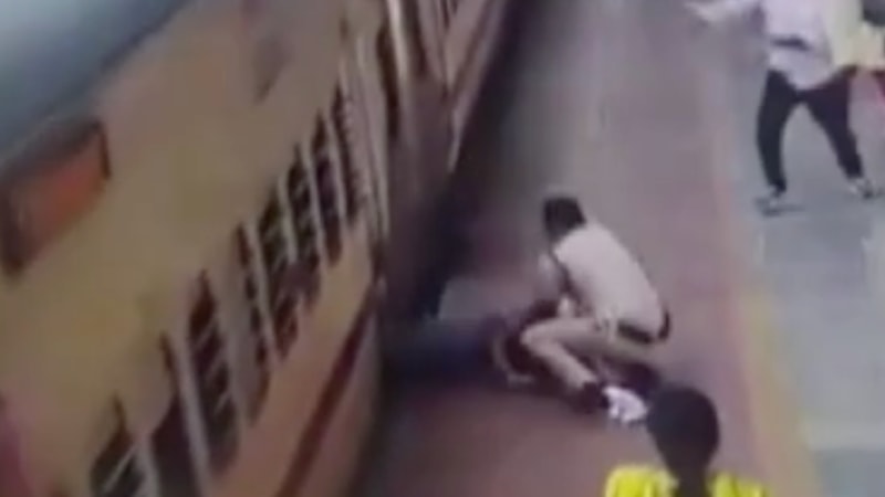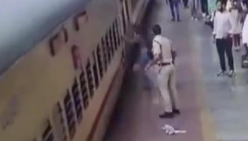 Nagpur kentinde bir kadın yolcu, hareket halindeki trene binmeye çalışırken dengesini kaybettiği sırada polisin hızlı müdahalesi sonucu ölümden döndü. O anlar kameraya yansıdı.